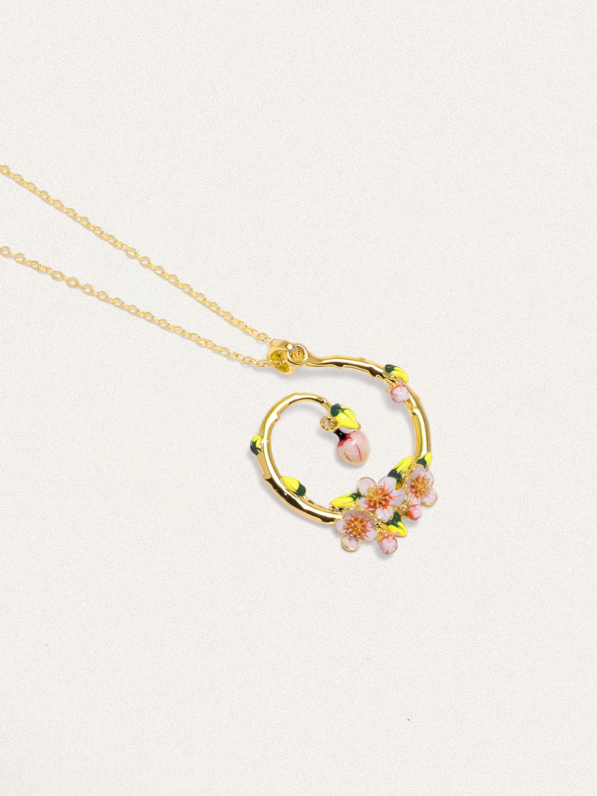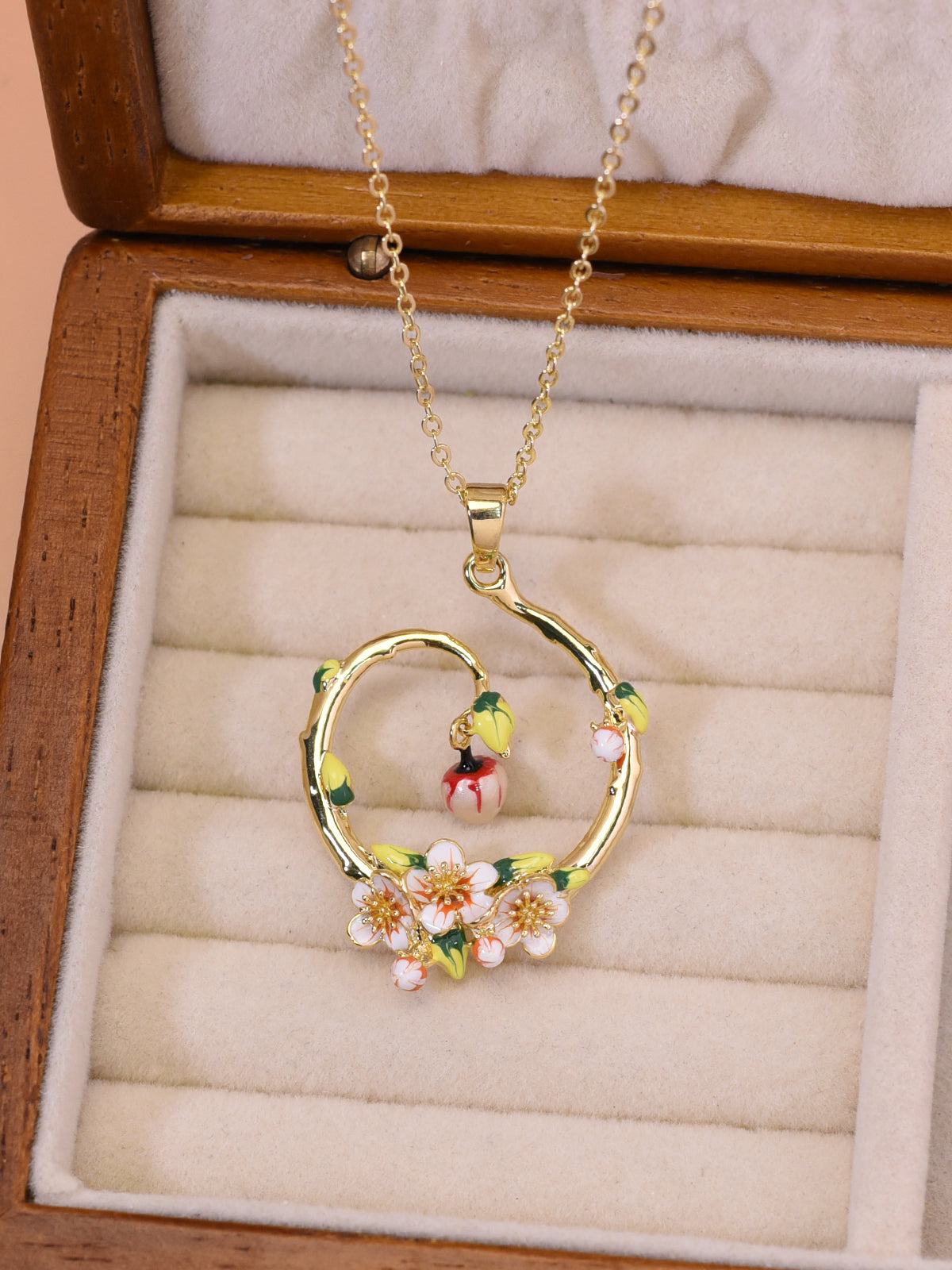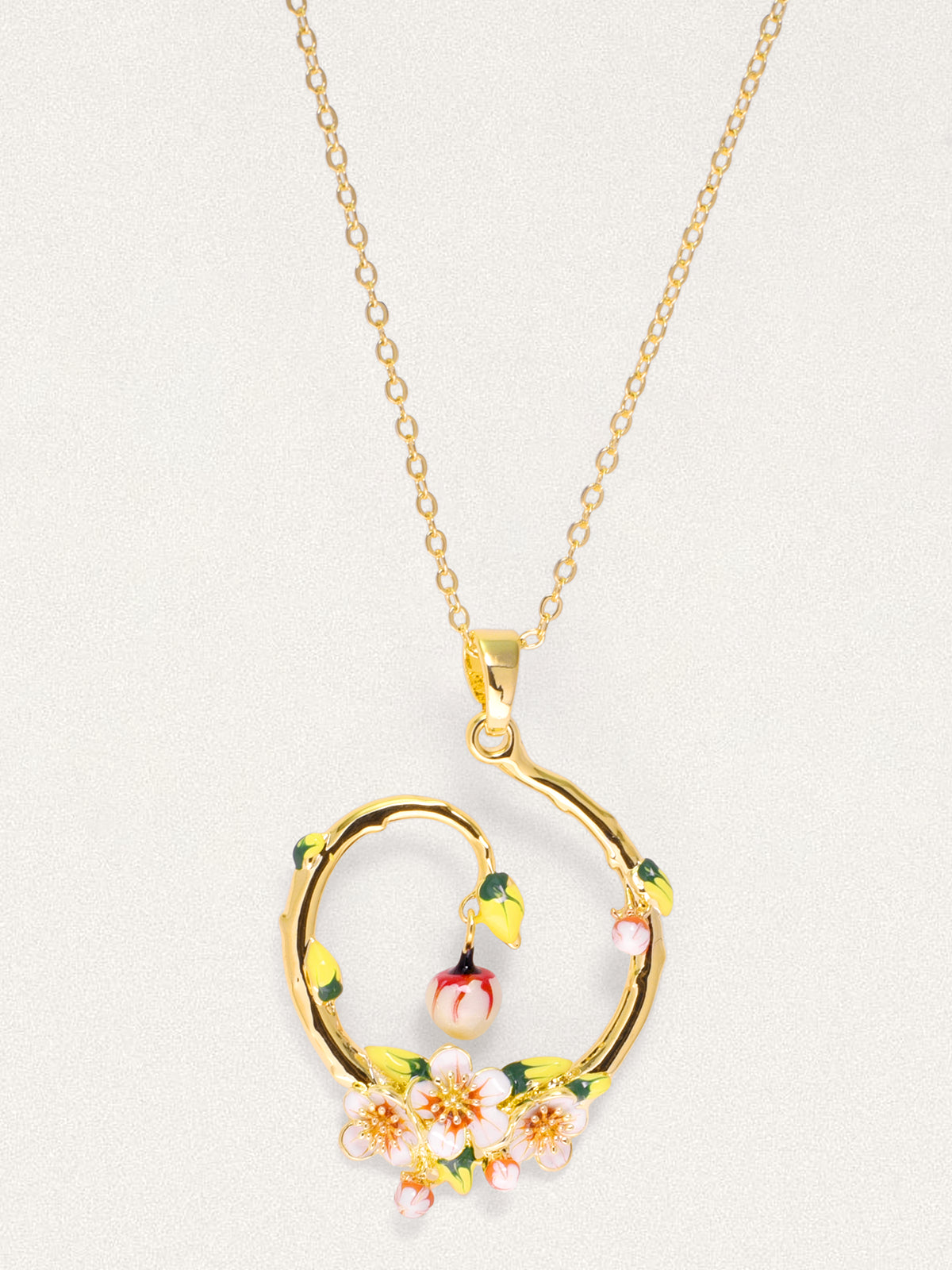 A tender branch curls into a heart, dotted with hand-painted blossoms and a tiny fruit bud that sways with your breath. It feels like catching the first warm day of spring and keeping it close to your collarbone.