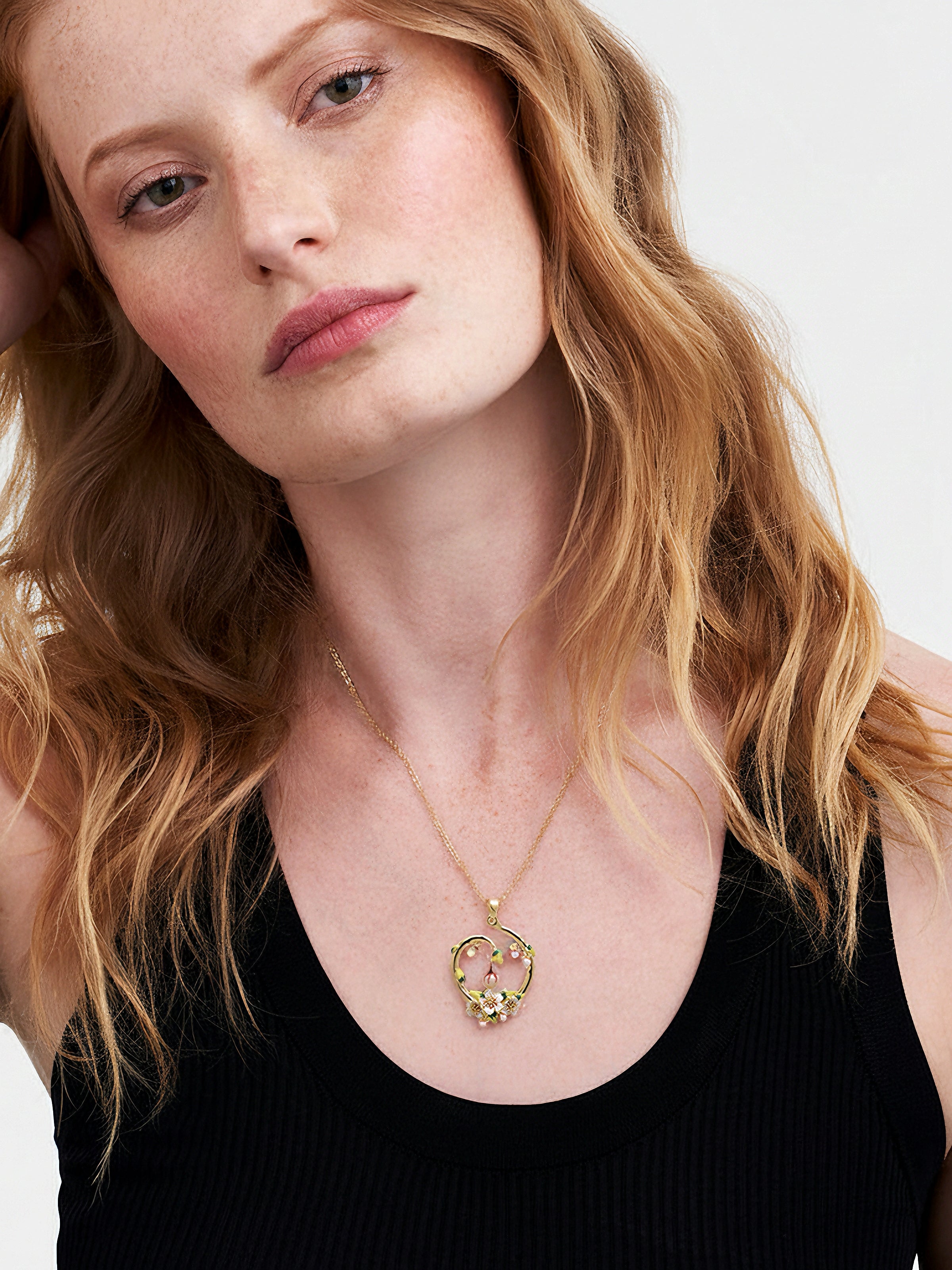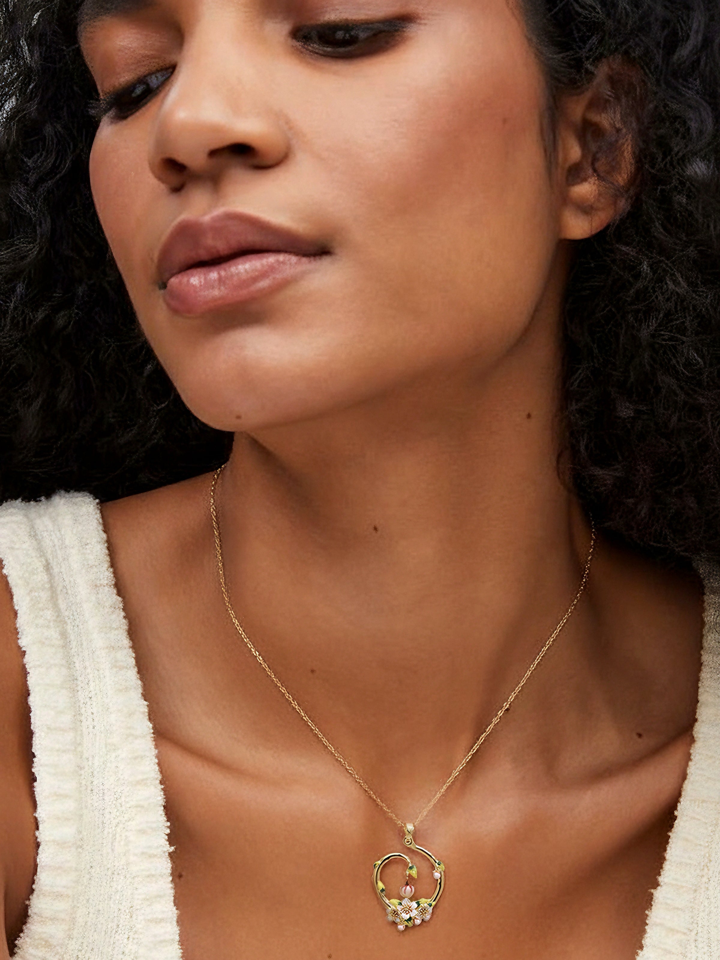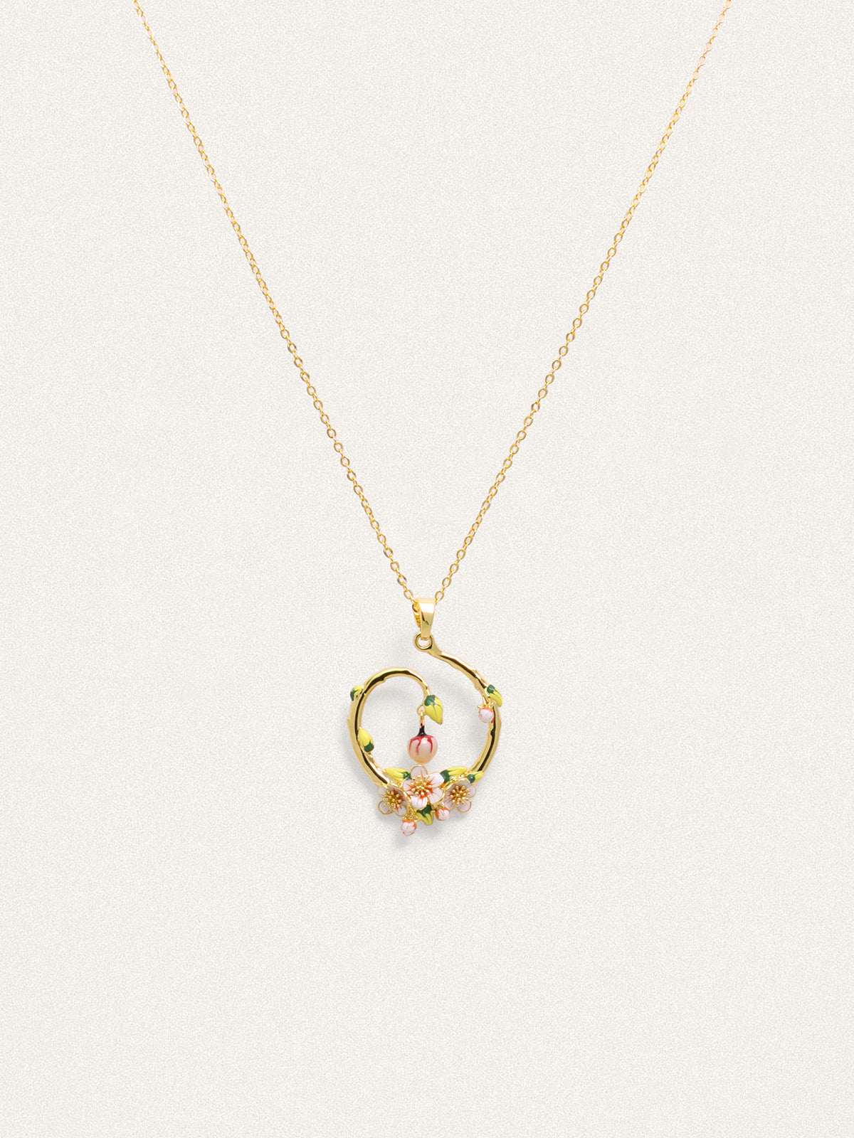 A tender branch curls into a heart, dotted with hand-painted blossoms and a tiny fruit bud that sways with your breath. It feels like catching the first warm day of spring and keeping it close to your collarbone.