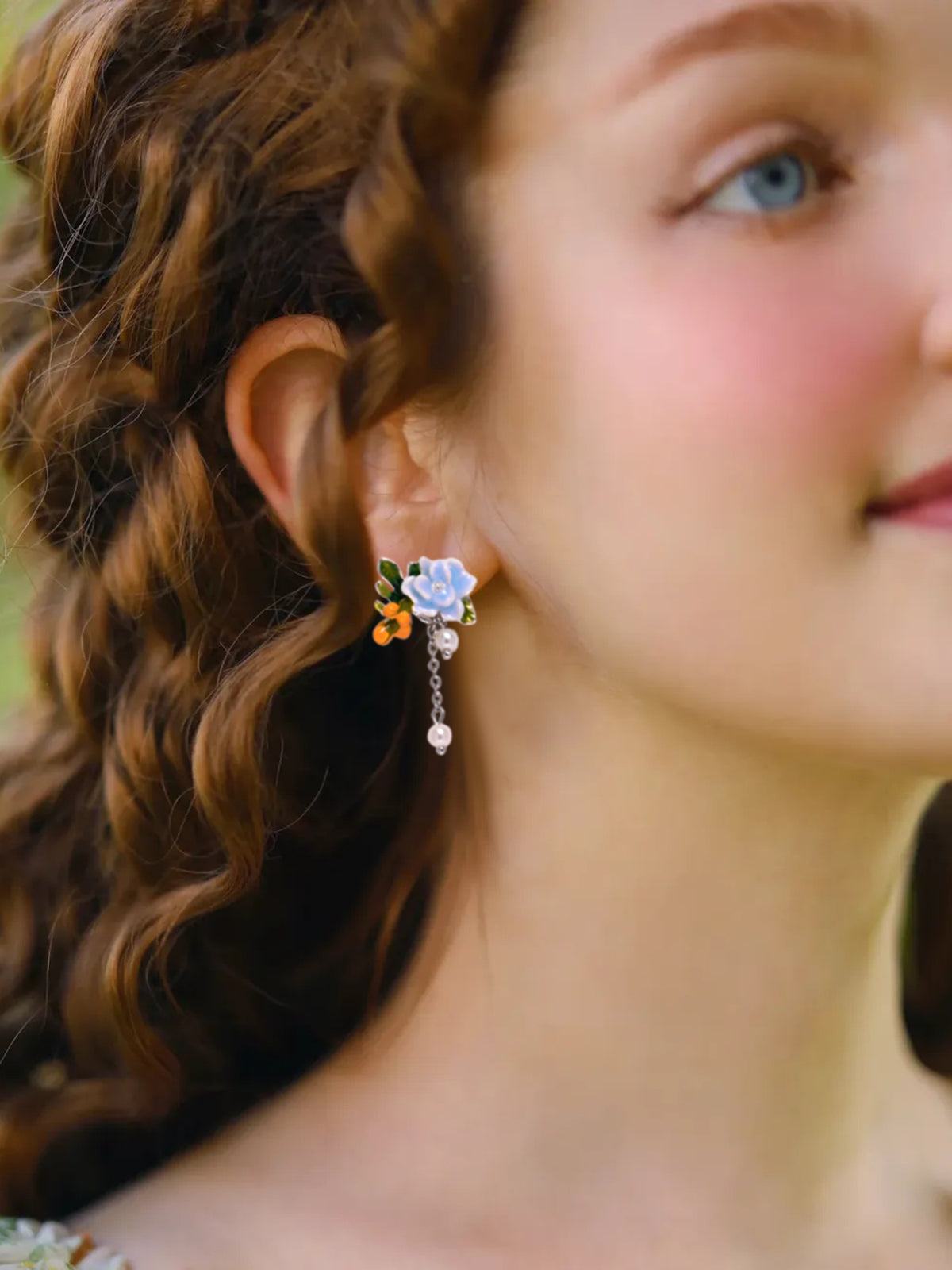 Sky-blue blossoms nestle beside sunny buds; twin pearl chains fall like morning dew. With each gentle sway, they soften the day—quiet, feminine, and full of promise.