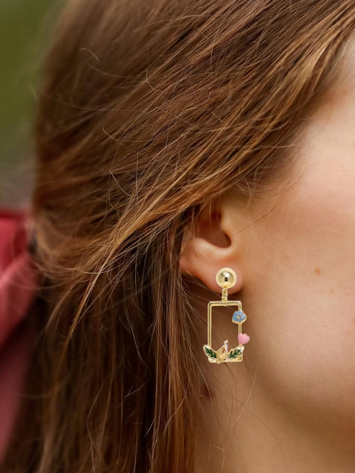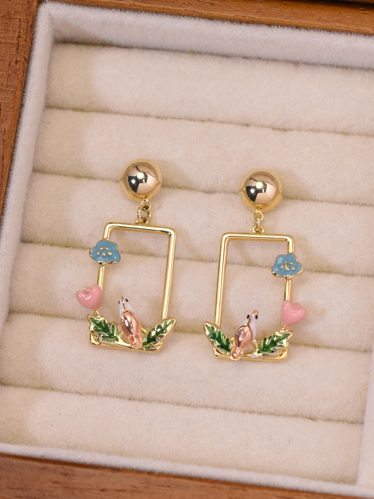 A golden frame opens like a tiny window to spring—bluebells and a pink heart sway above a resting songbird. Light catches the enamel leaves and suddenly you’re back in your quiet garden, breathing easy. For the woman who keeps a soft place inside, no matter how busy the world grows.