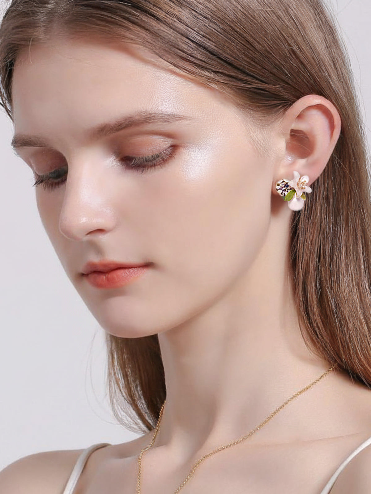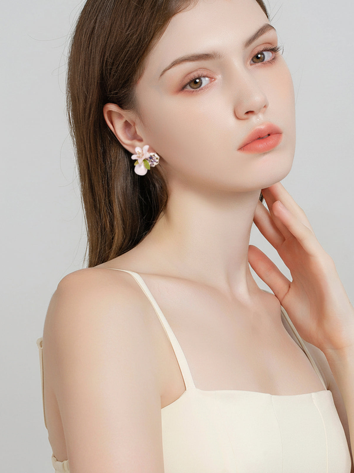 A blush enamel flower cradles a dew-bright crystal, finished with a soft pink drop and tender green leaves. A small scene of spring worn close to the face—quiet, luminous, and reassuring. For the woman who lets gentleness be her strength and small joys be her light.