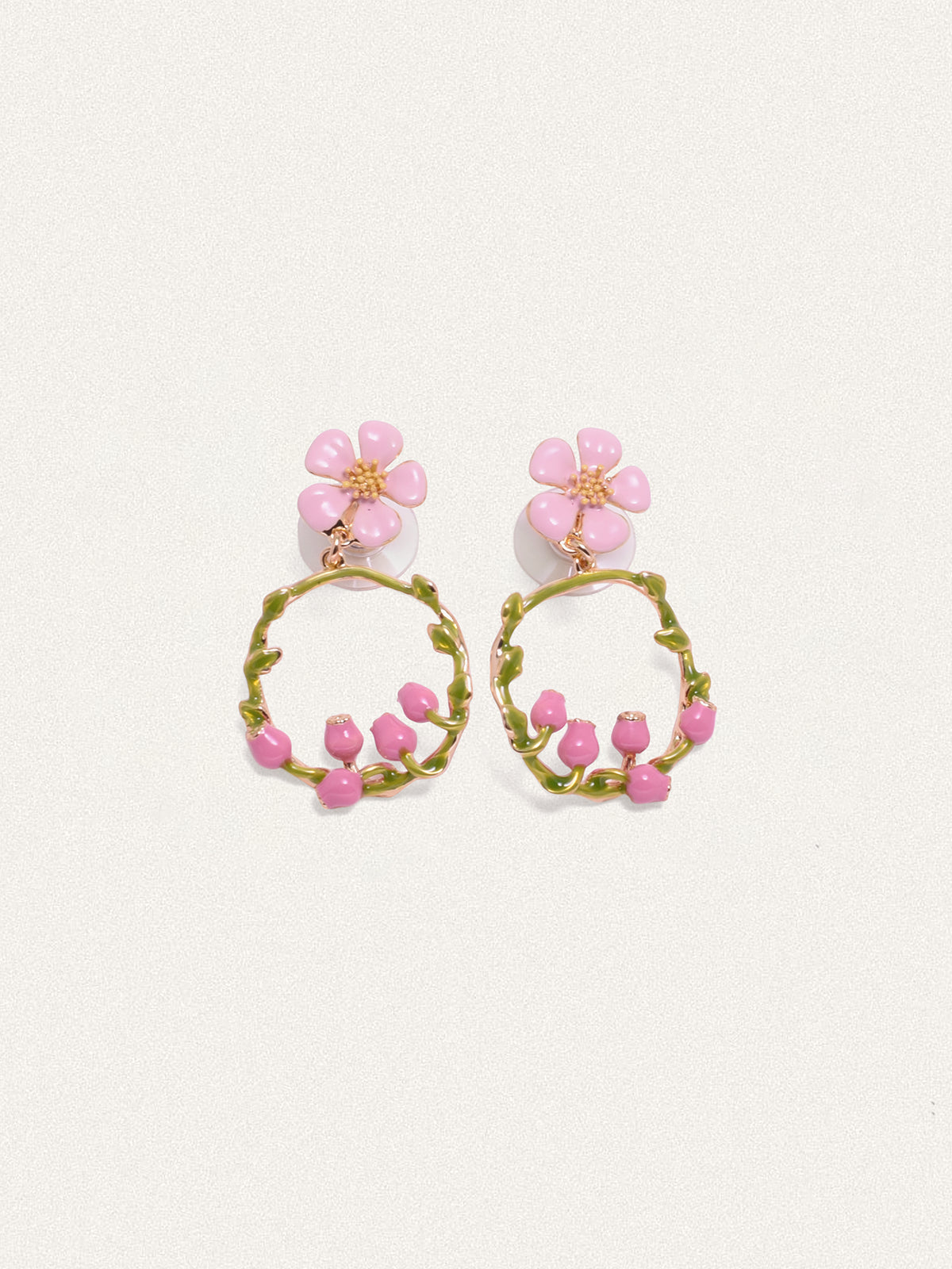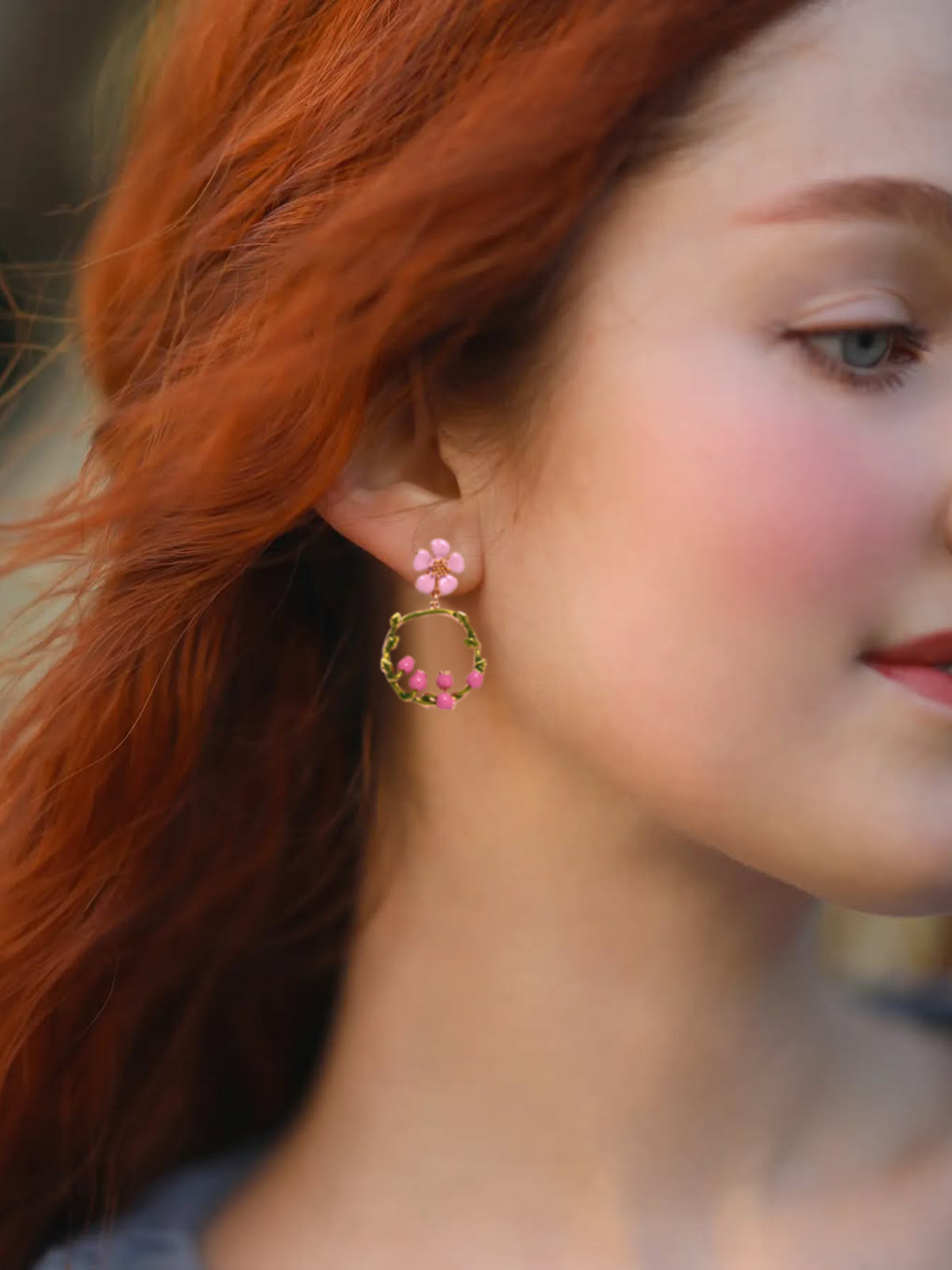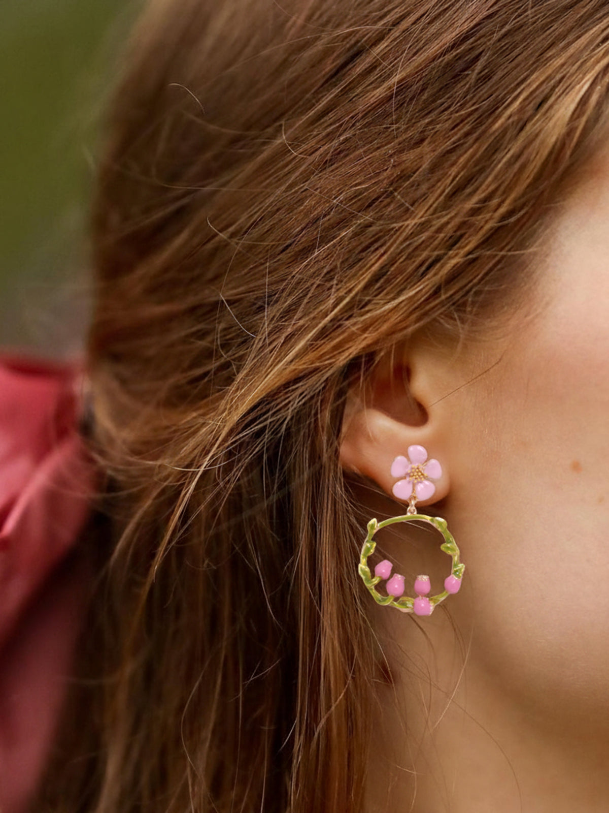 A blush blossom crowns a wreath of tiny buds—like spring caught mid-bloom. The open circle frames your smile and sways with quiet optimism, reminding you to grow at your own pace. Crafted with hand-enameled petals and sculpted vinework, it carries the softness that steadies you and the courage that moves you forward.