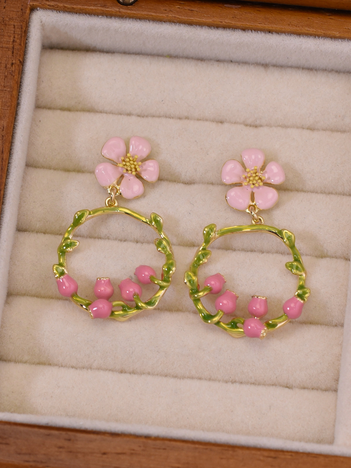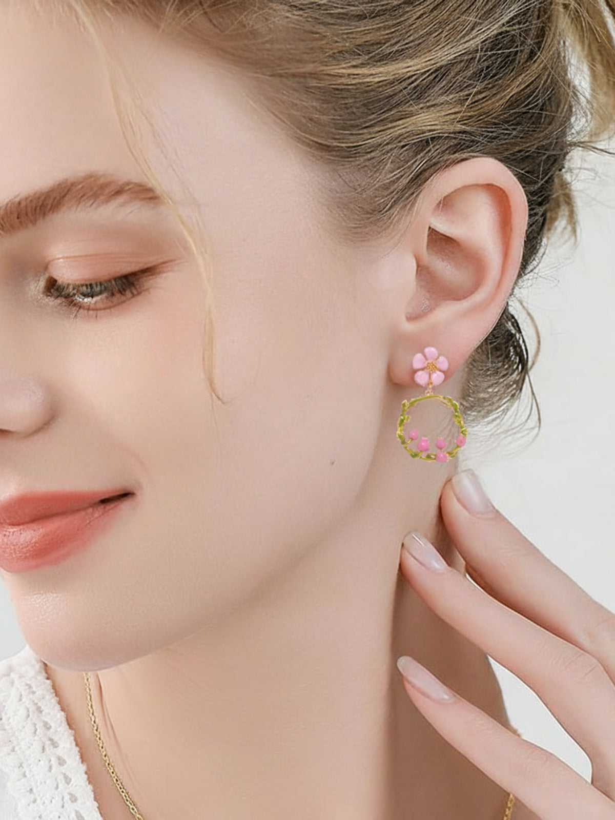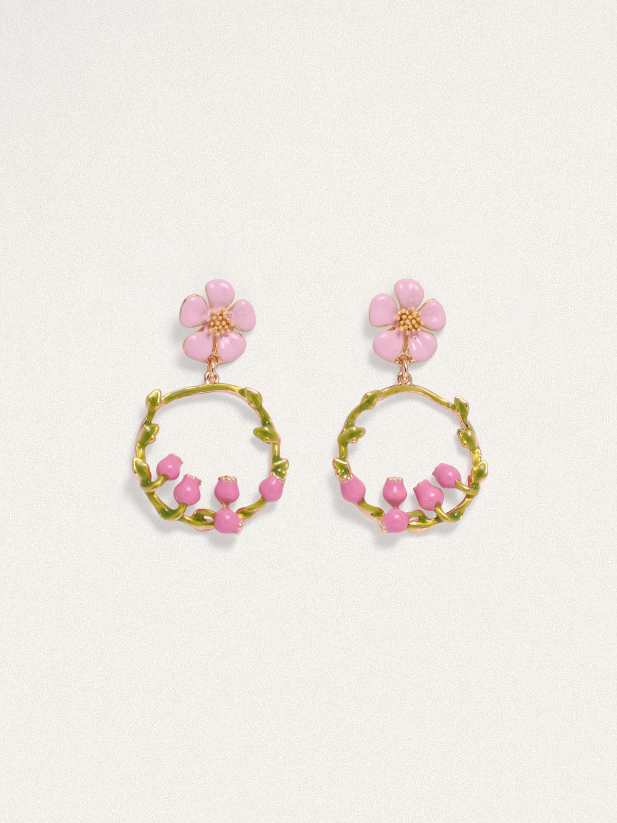 A blush blossom crowns a wreath of tiny buds—like spring caught mid-bloom. The open circle frames your smile and sways with quiet optimism, reminding you to grow at your own pace. Crafted with hand-enameled petals and sculpted vinework, it carries the softness that steadies you and the courage that moves you forward.