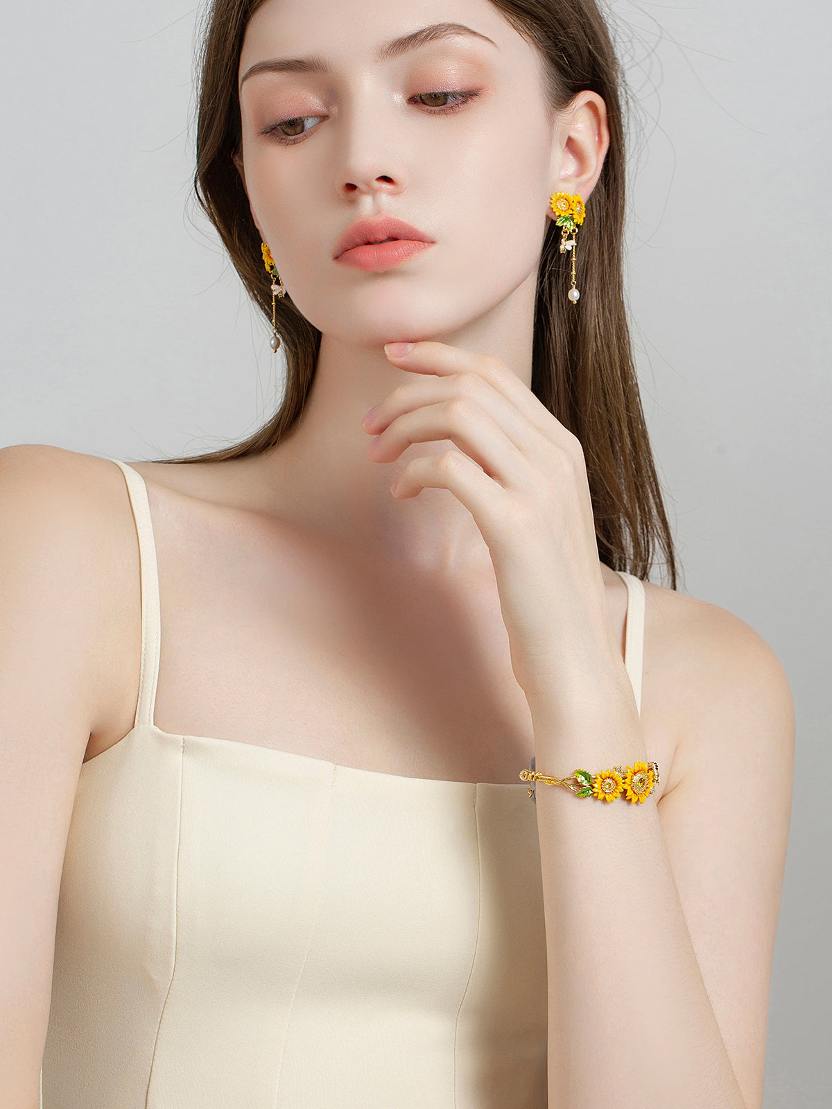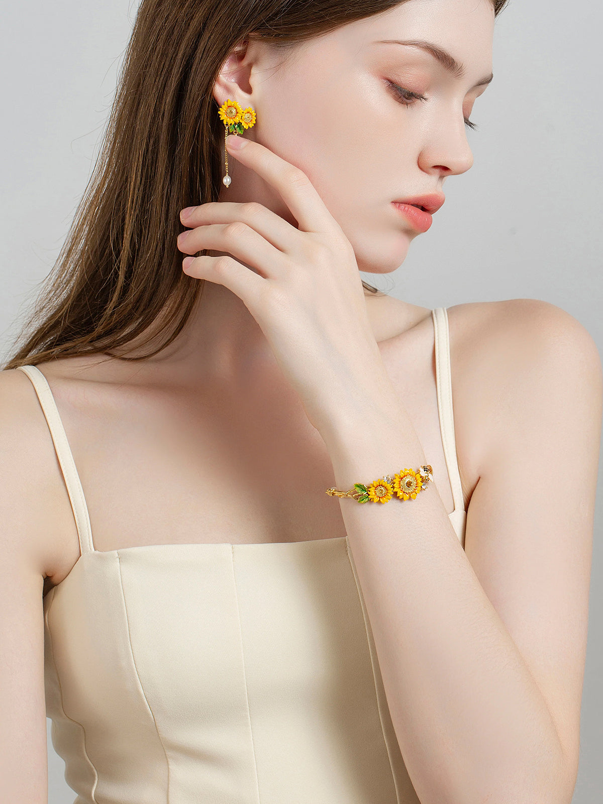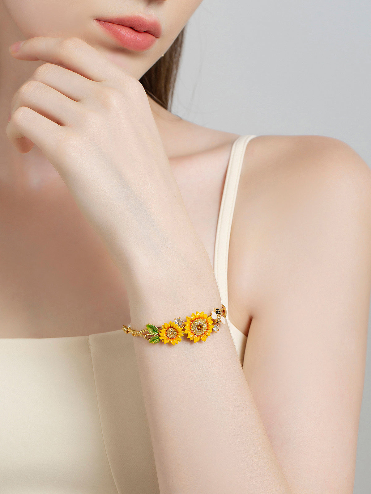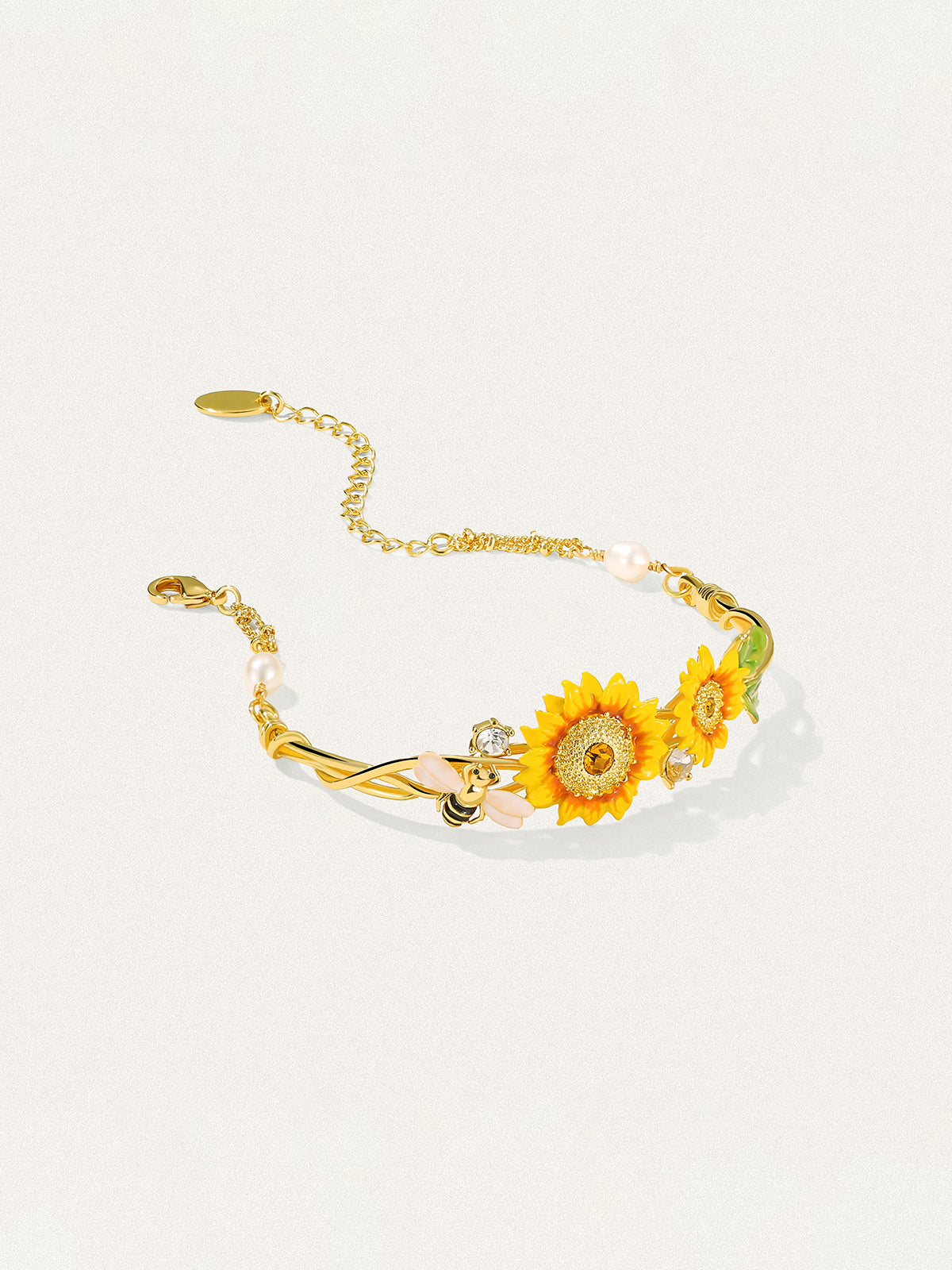 A wreath of sunflowers circles the wrist, brightened by a gentle bee and soft pearls. It wears like a little sun you carry all day—lifting mood, steadying heart, inviting good days in.