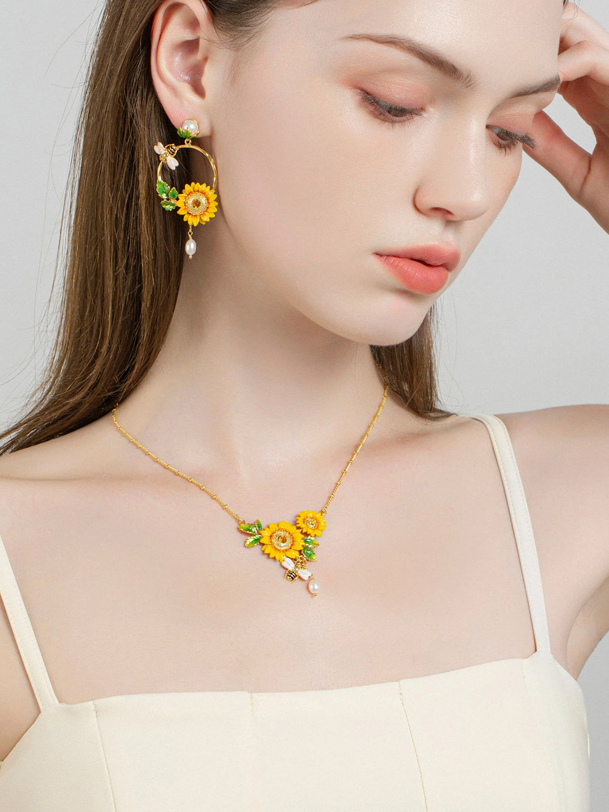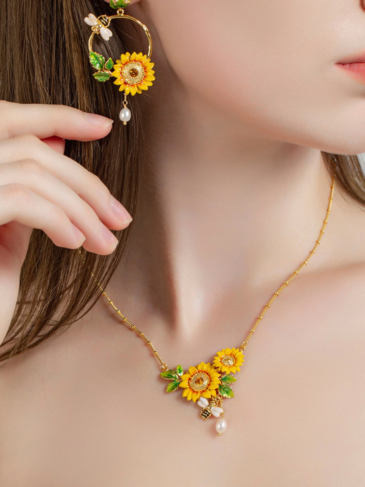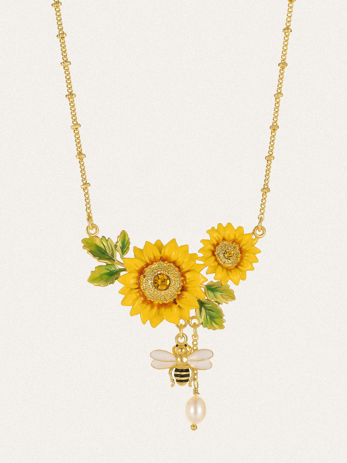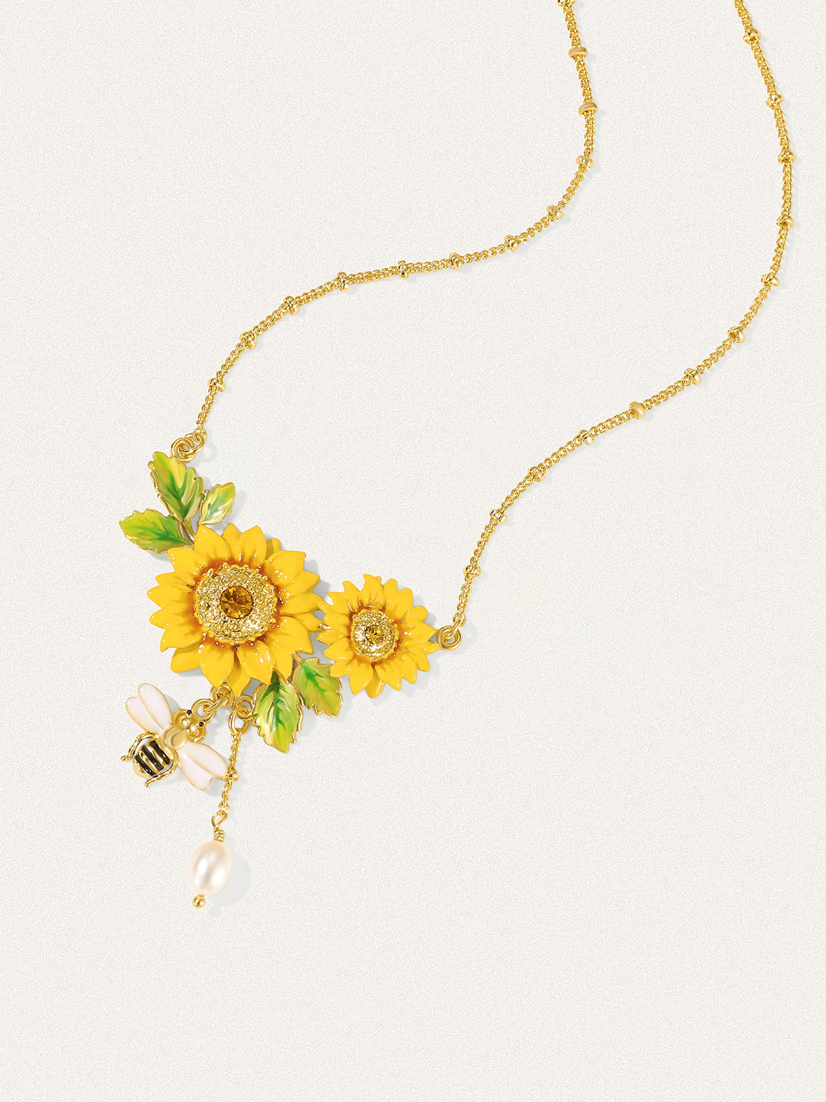 Two golden sunflowers gather at the collarbone; a tiny bee and pearl drop trace a ray of light. This necklace is a quiet vow to meet the day with warmth and grace—and to bloom where you are.