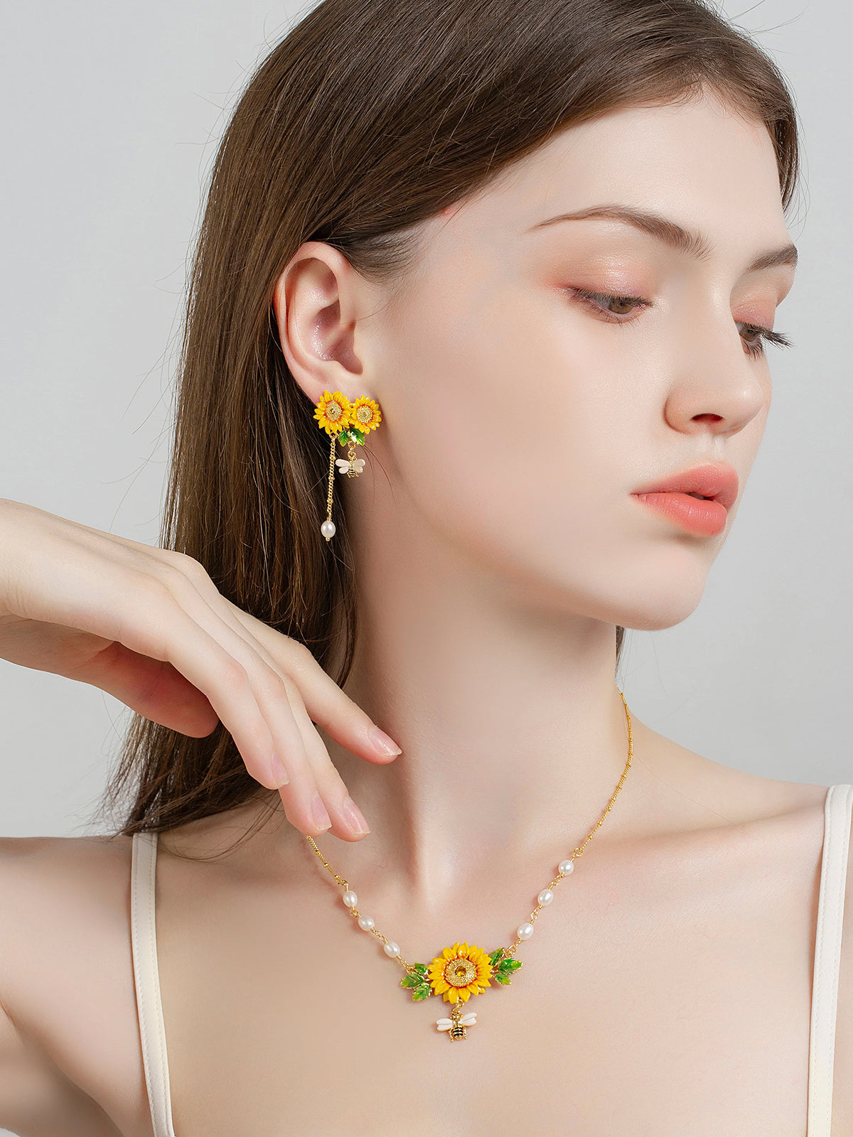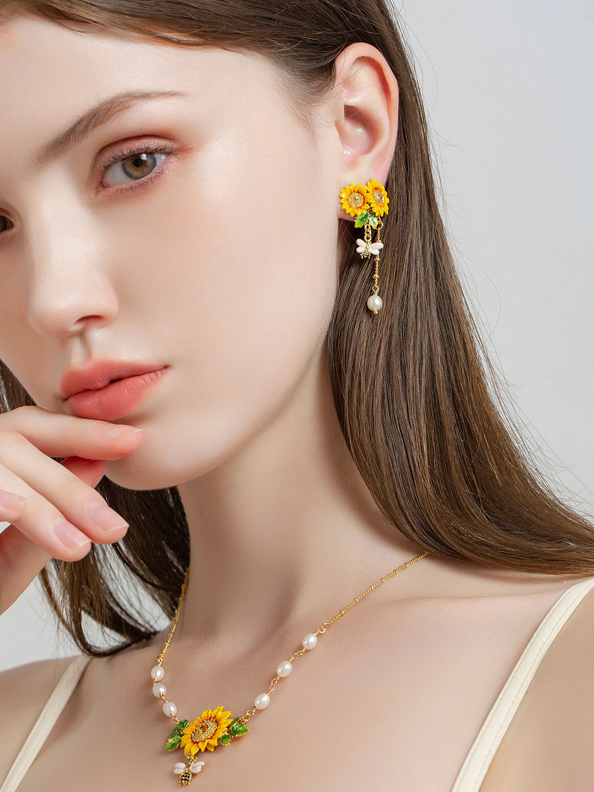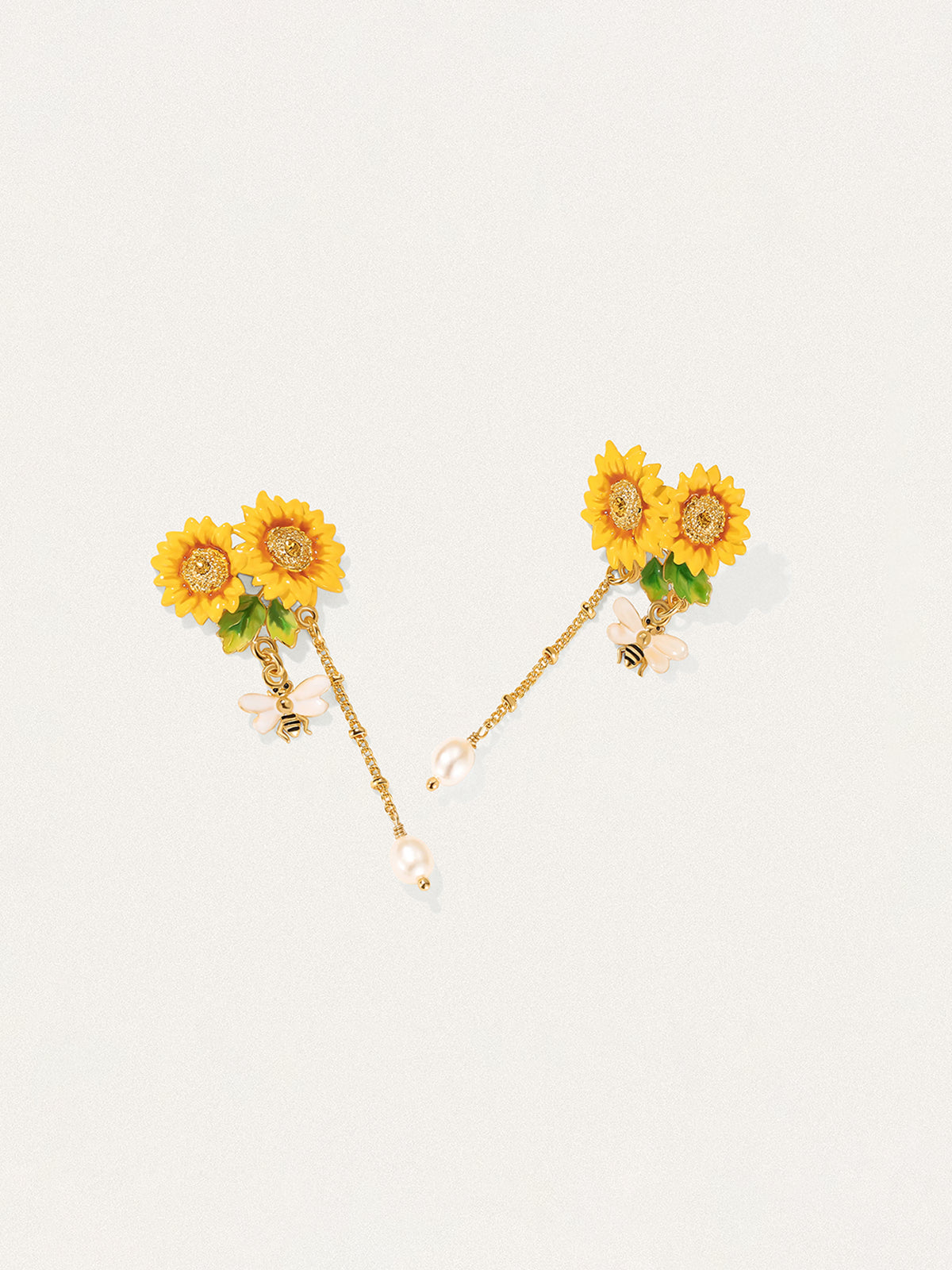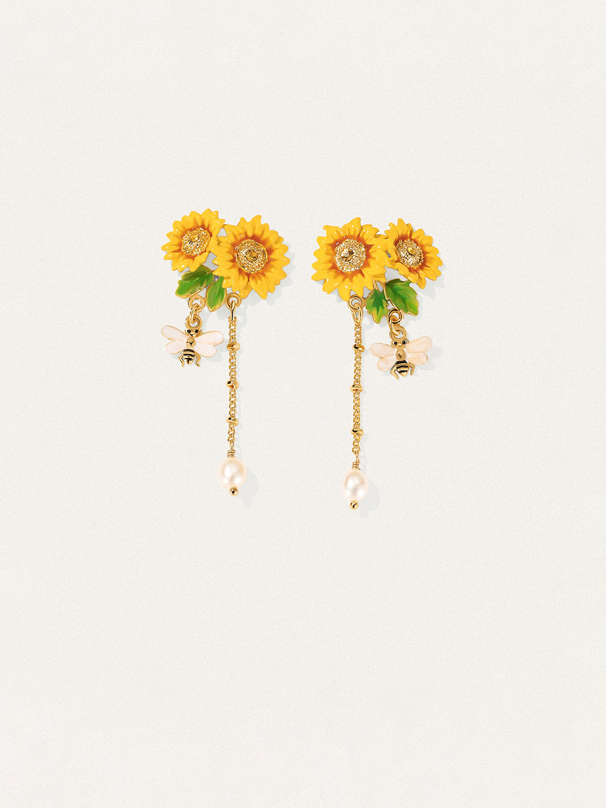 Twin sunflowers shine with golden hearts as a tiny enamel bee hovers below. A drop-pearl sways like morning light on skin. Wear them as a promise to face the sun—no matter the weather—and let joy find you.