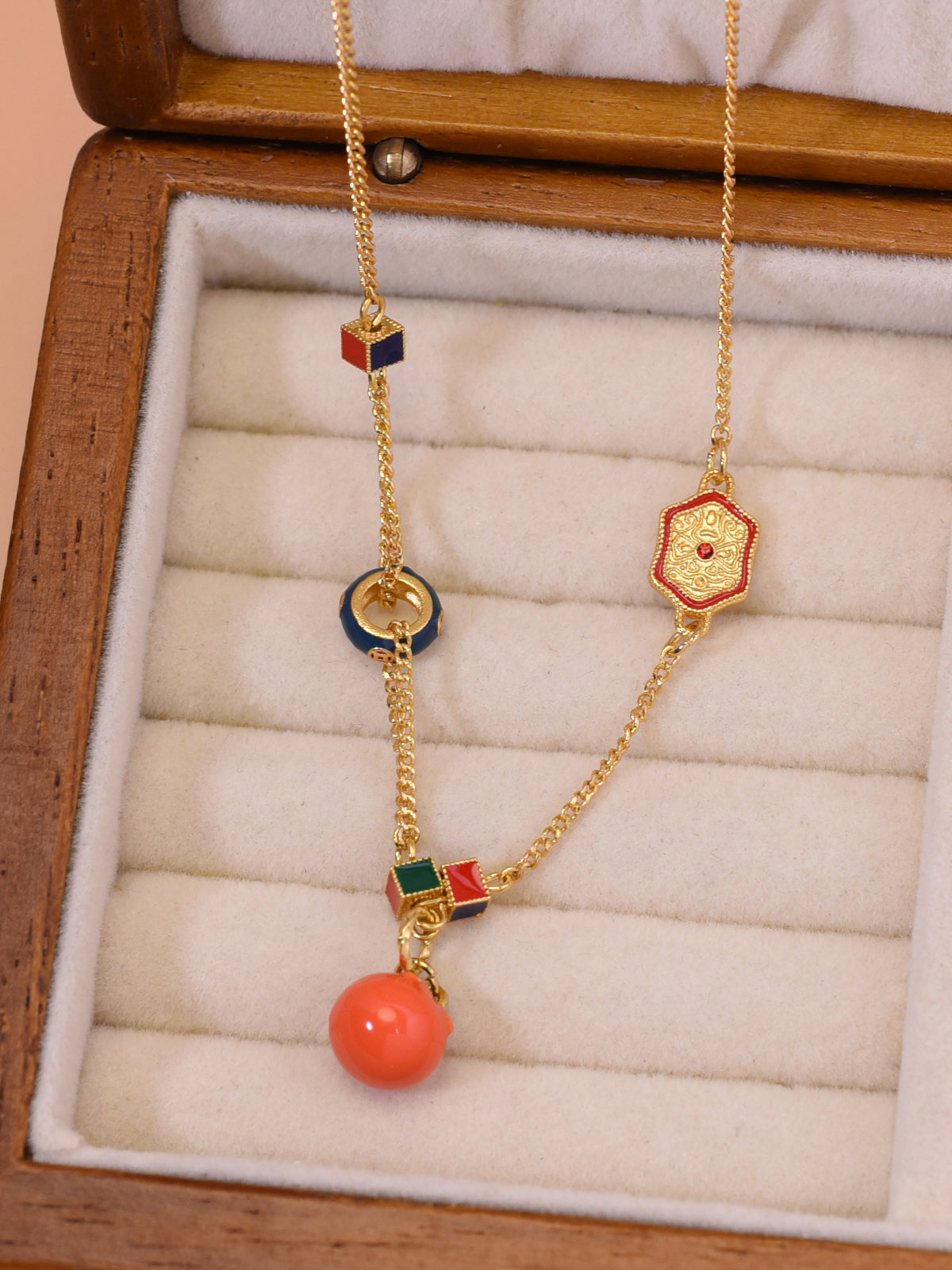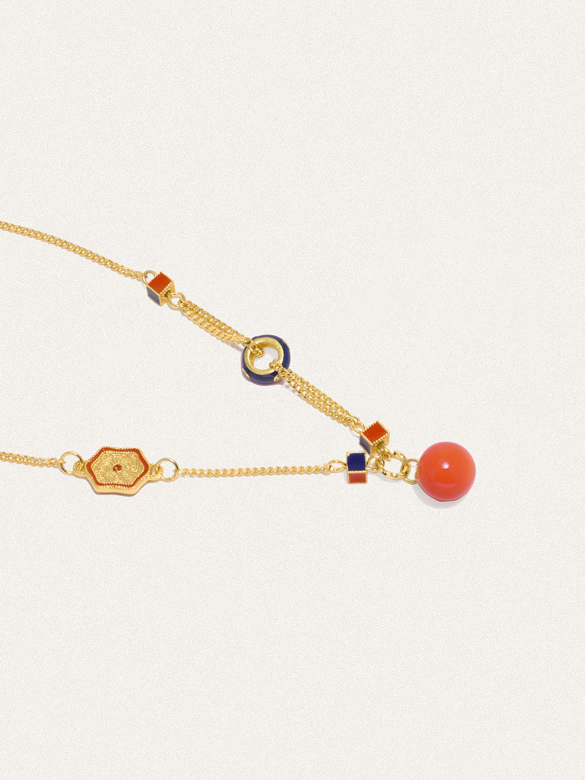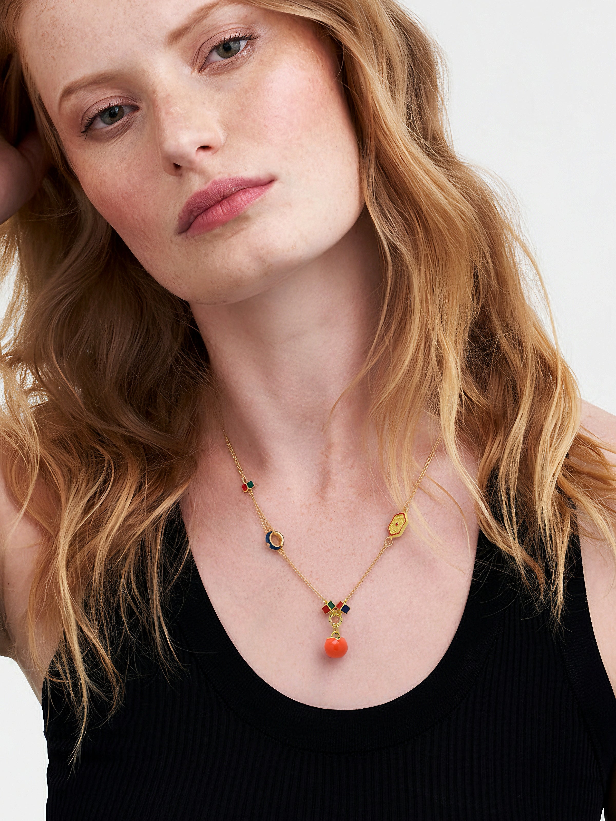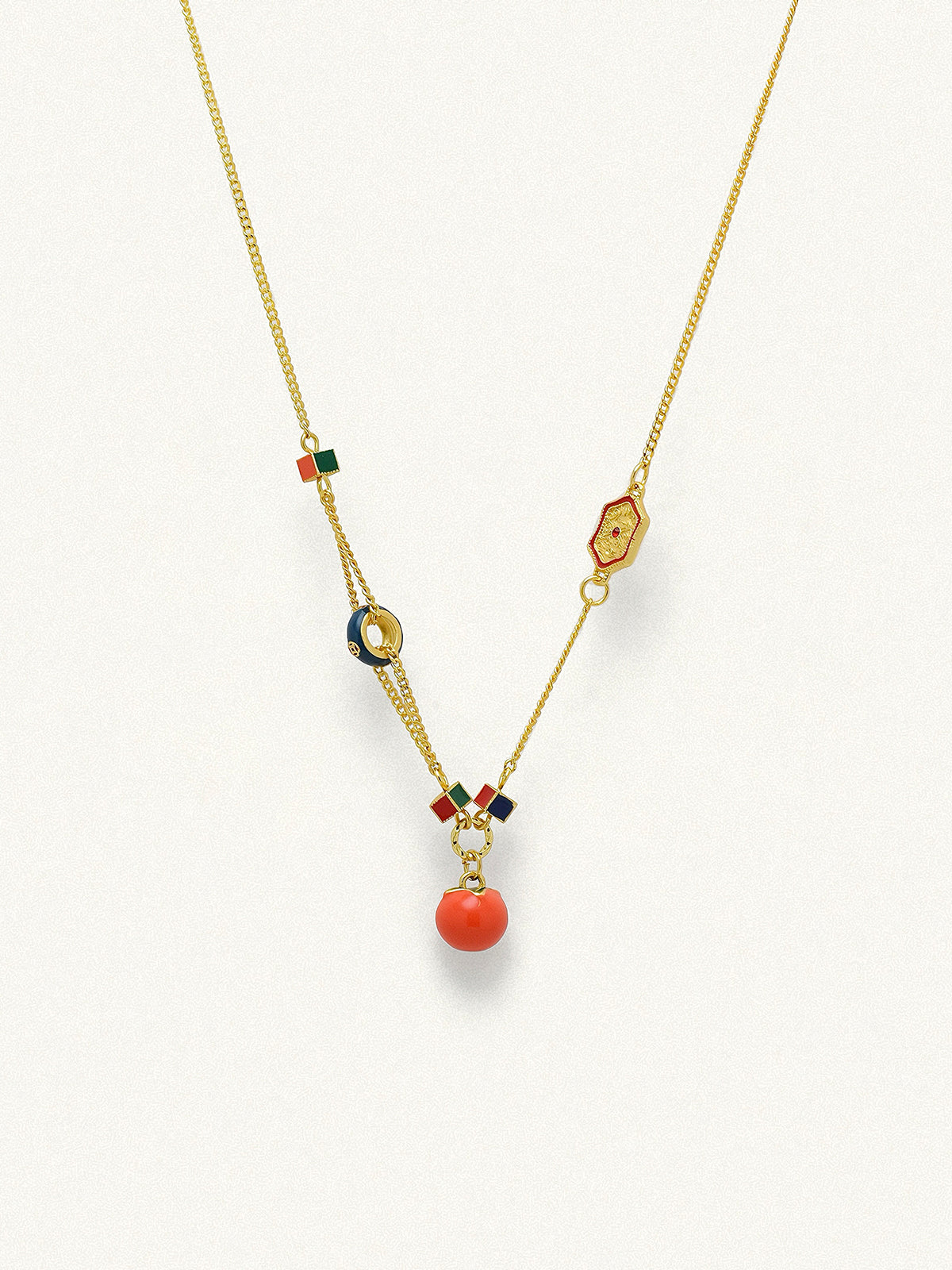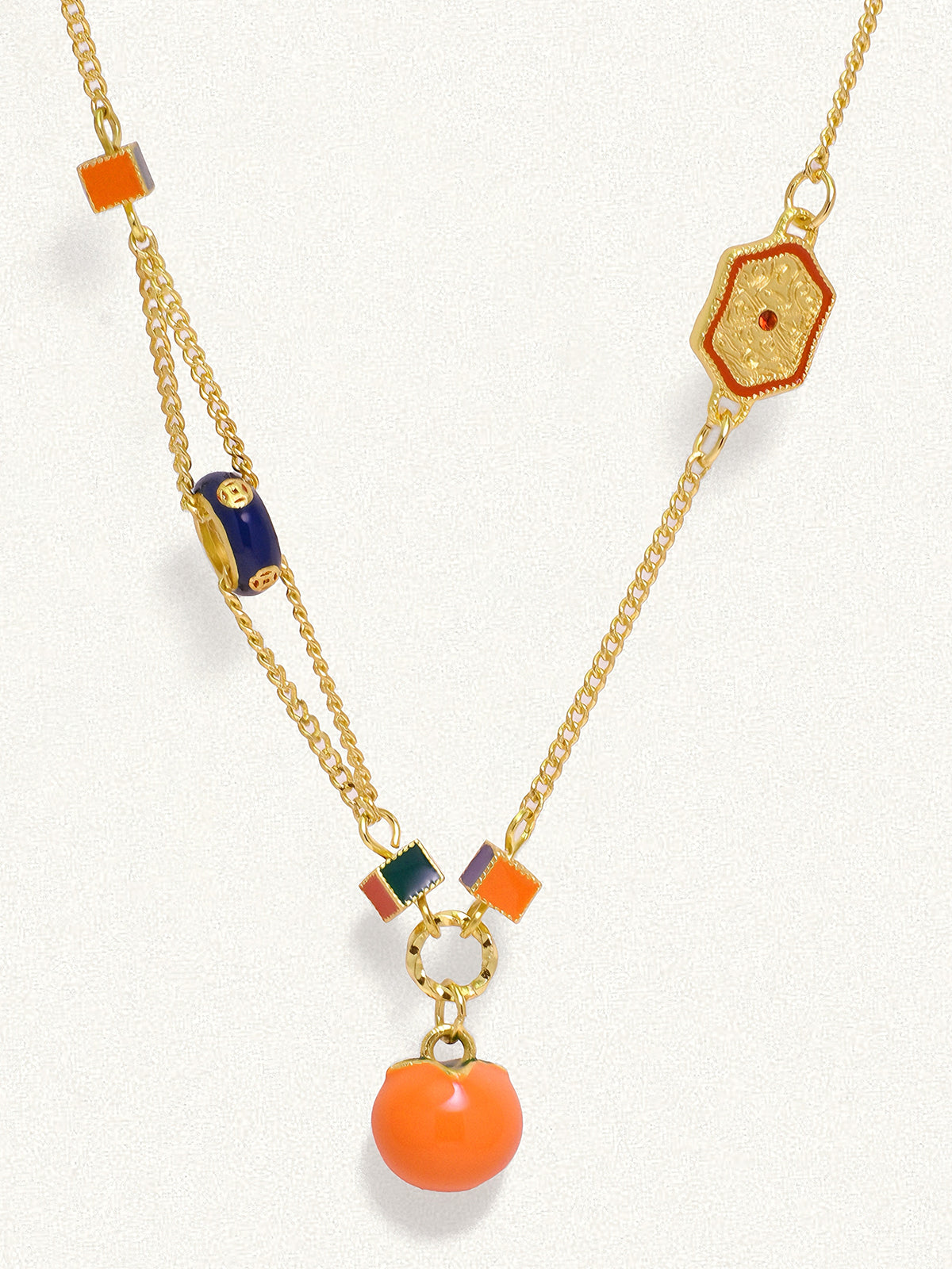 A little gallery on a chain—tiny enamel cubes, a sapphire-blue ring, a lucky red plaque and a glossy tangerine drop meet mid-air. As you move, the charms trade glances and color—like confetti catching sunlight. It’s for the days you want life to feel brighter, bolder, more you.