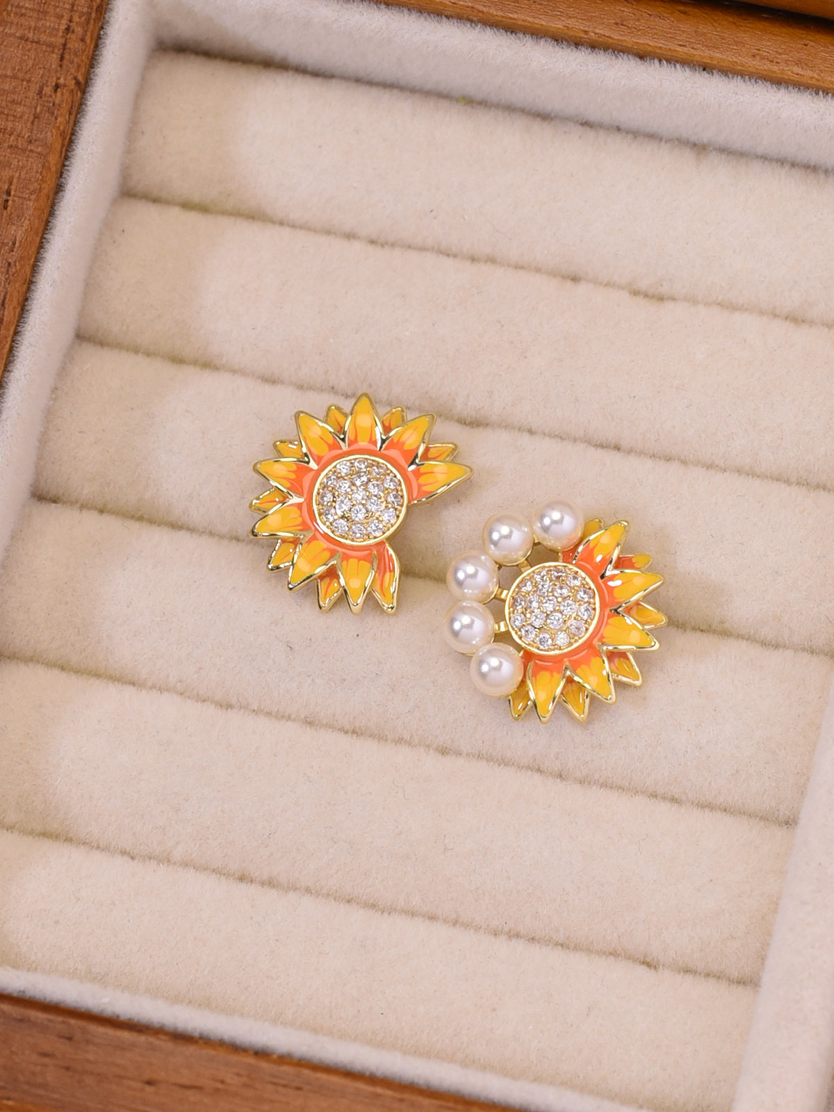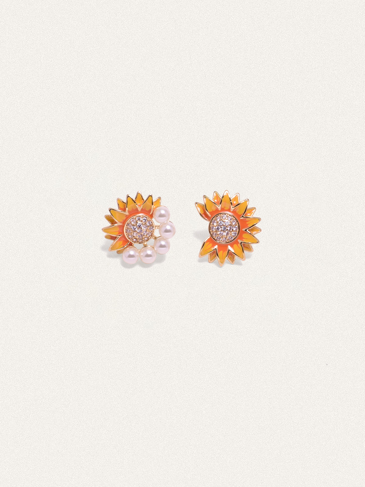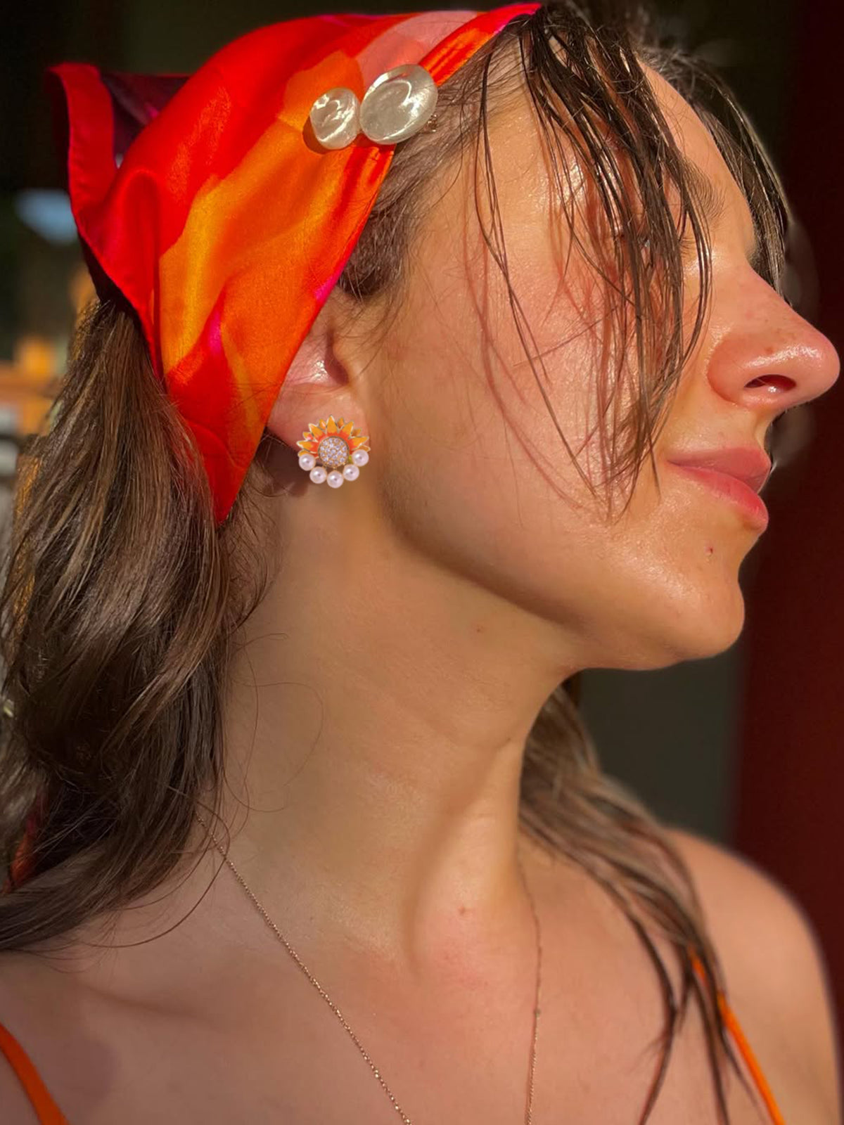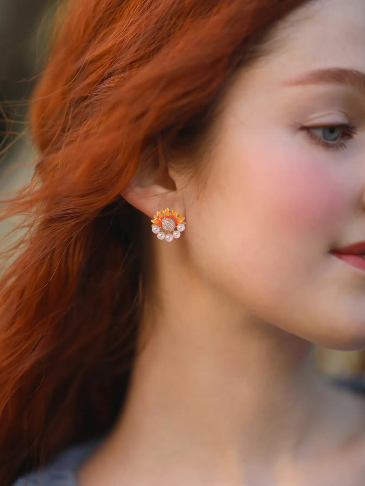 Sunlit enamel petals frame a pavé center, while tiny pearls arc like dawn. These studs turn toward joy—reminding you to meet each day with warmth and courage. Wear them when you need a quiet lift, a little sun you carry.