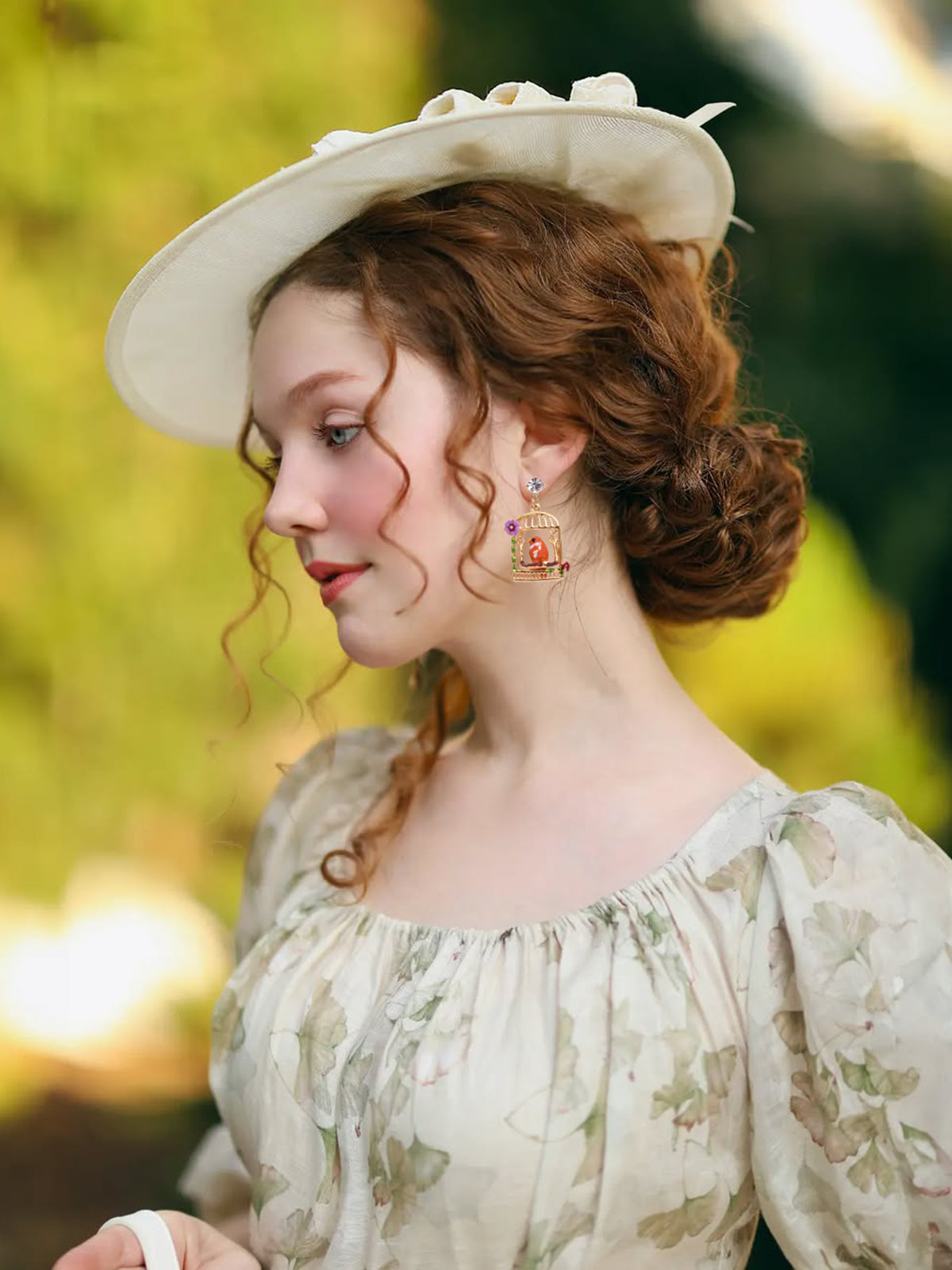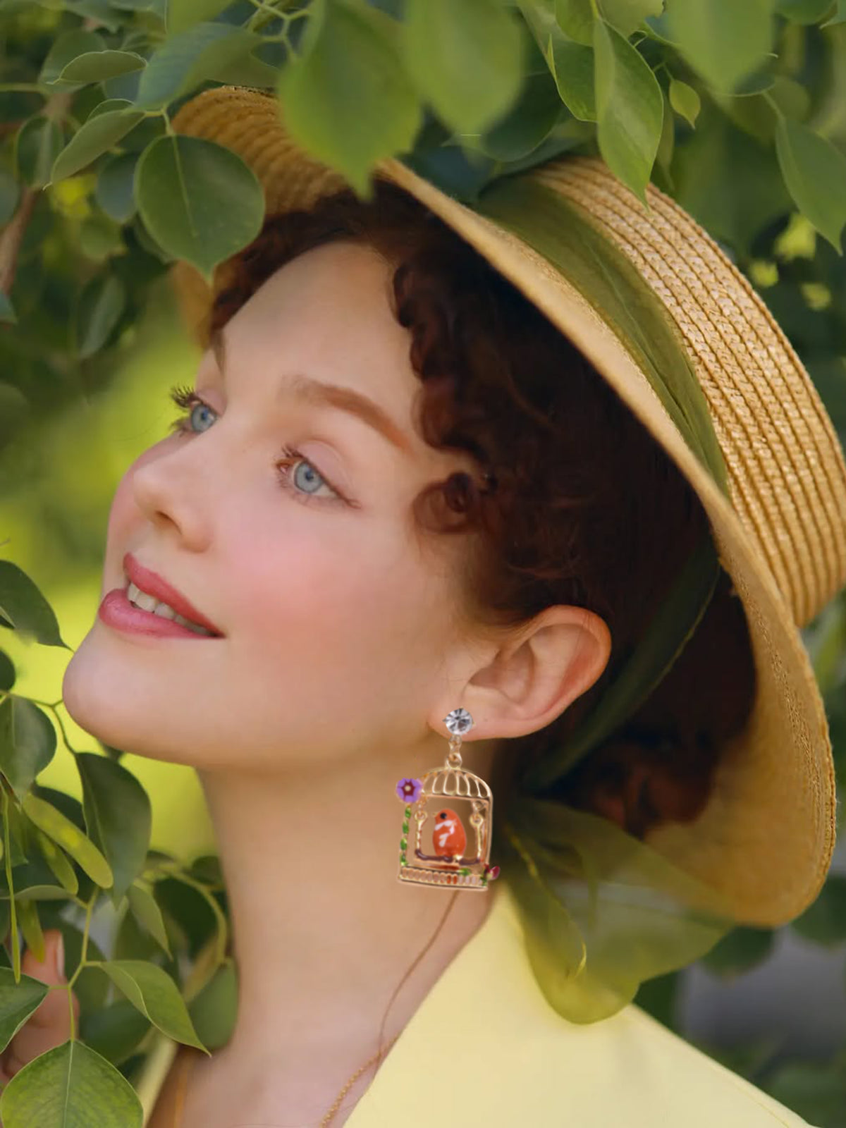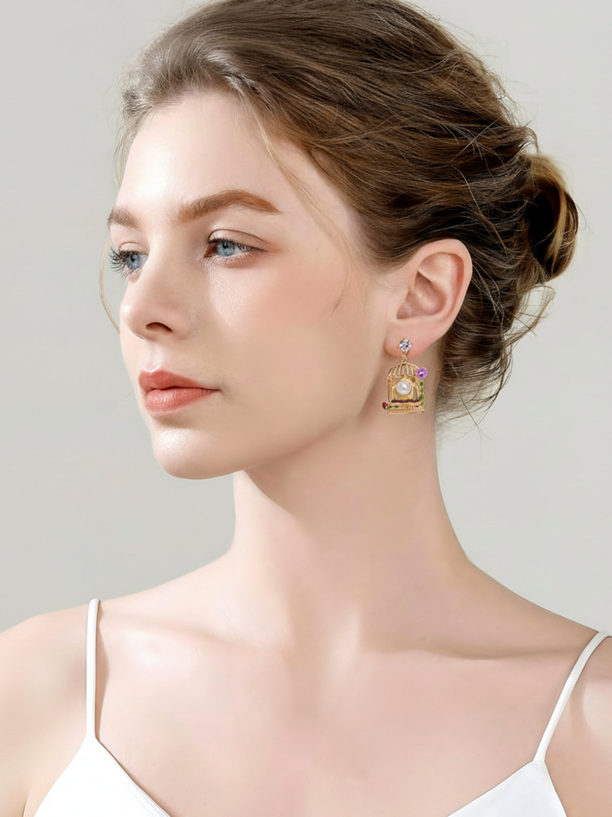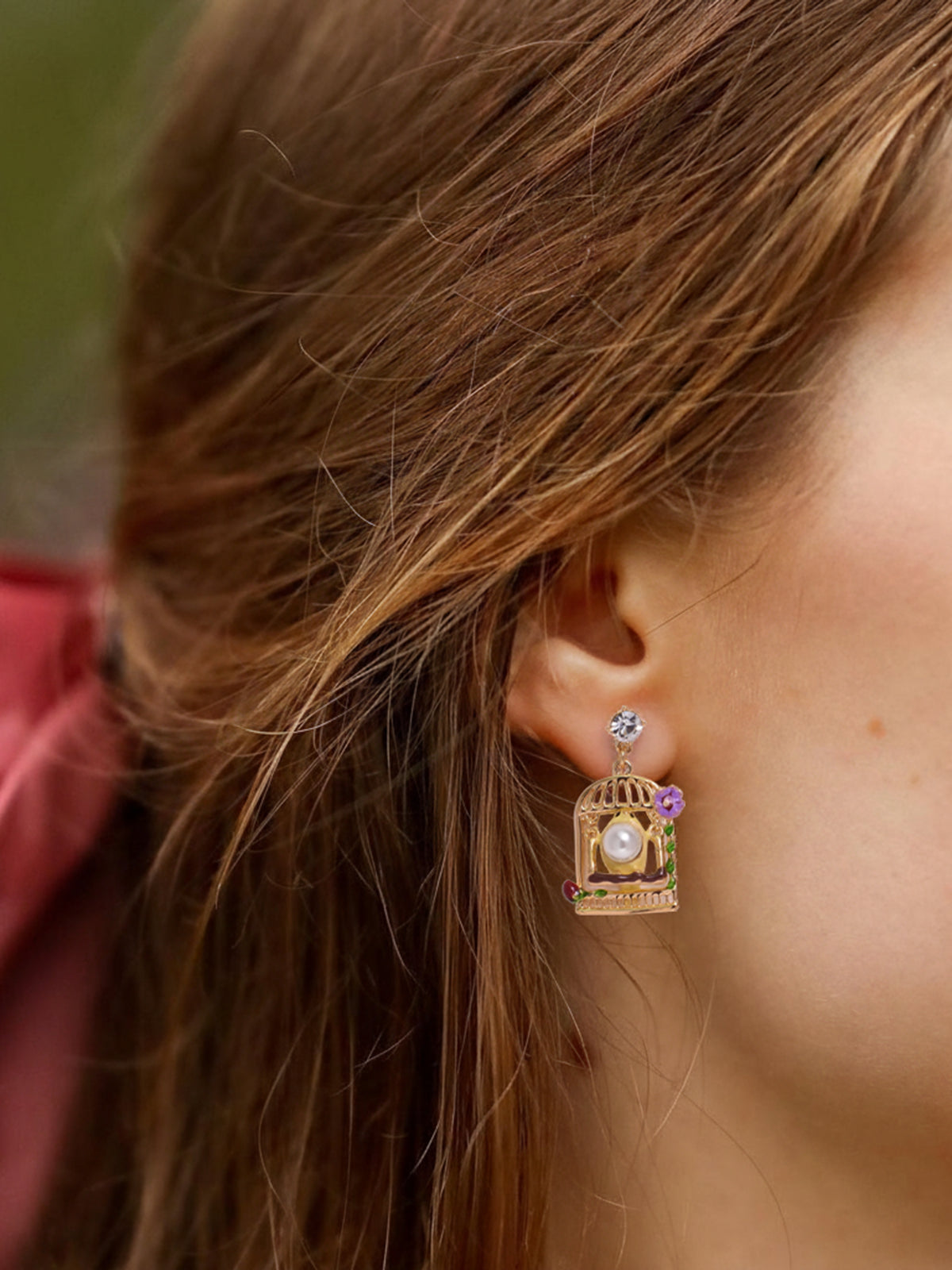 A tiny garden hangs by your cheek: one cage holds a glowing pearl, the other a shy songbird perched among violets and vines. As you move, light slips through the golden bars—like morning sun through a window, reminding you that gentleness can be brave. For the woman who keeps wonder close and lets her heart sing softly.