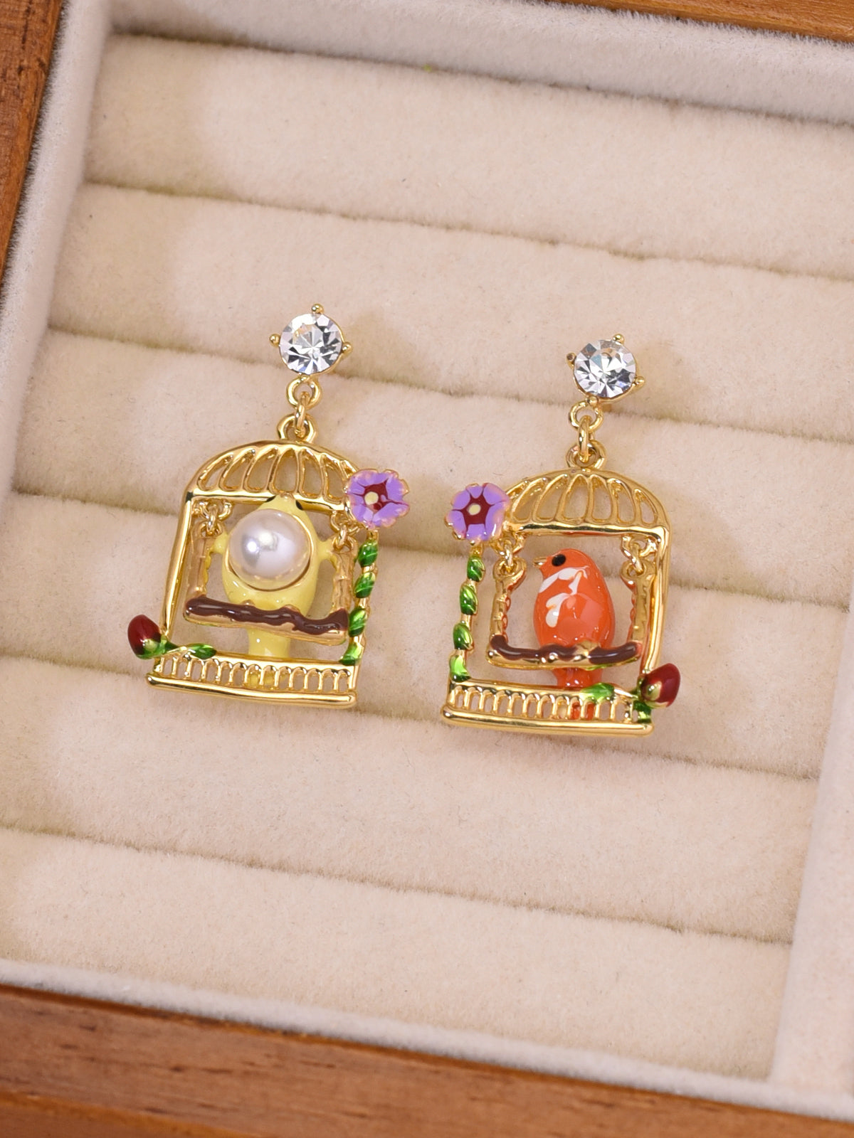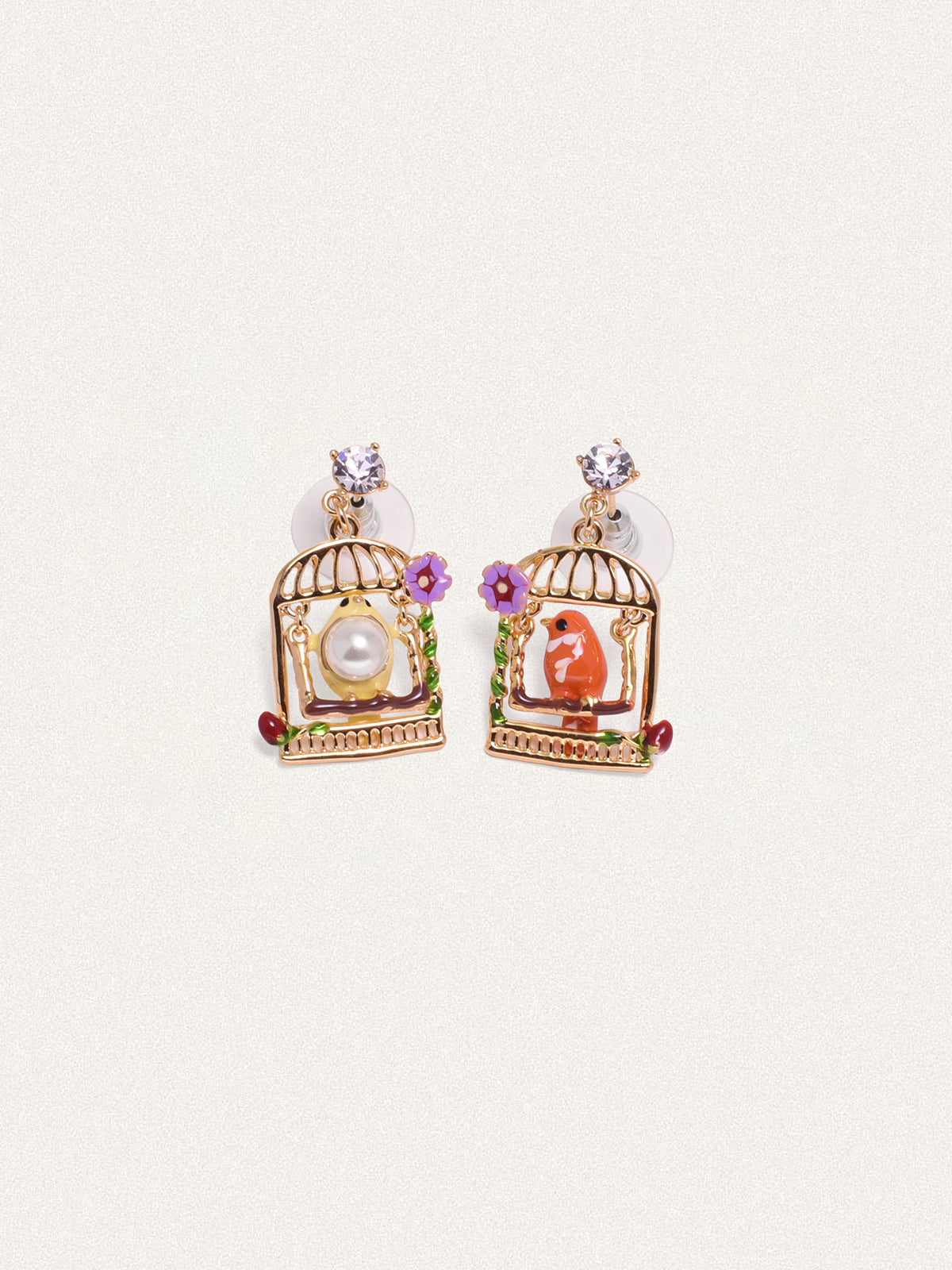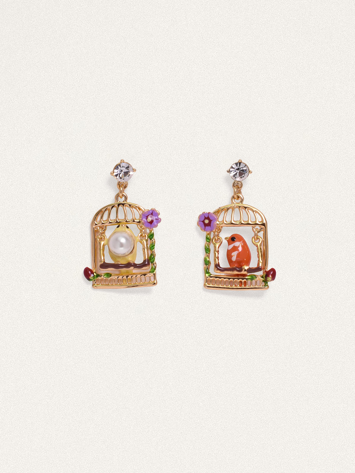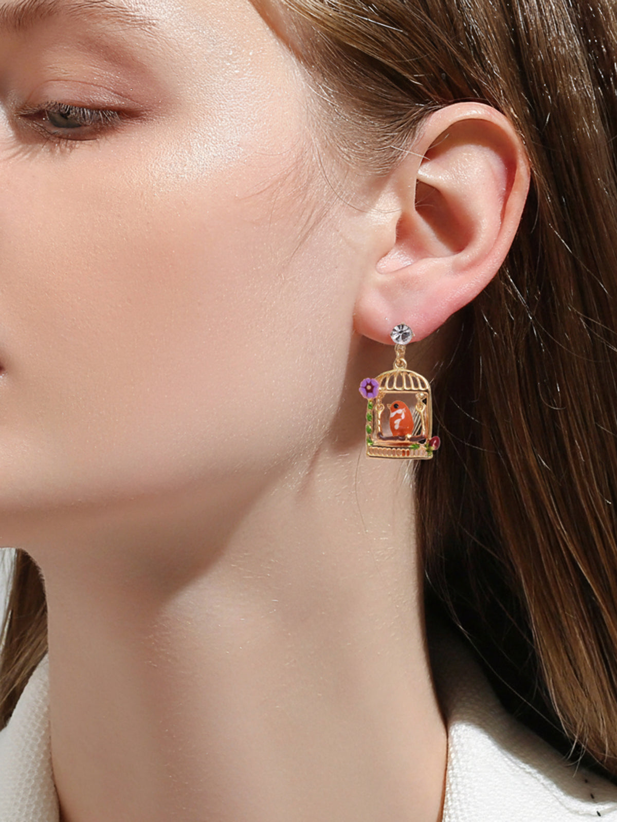 A tiny garden hangs by your cheek: one cage holds a glowing pearl, the other a shy songbird perched among violets and vines. As you move, light slips through the golden bars—like morning sun through a window, reminding you that gentleness can be brave. For the woman who keeps wonder close and lets her heart sing softly.