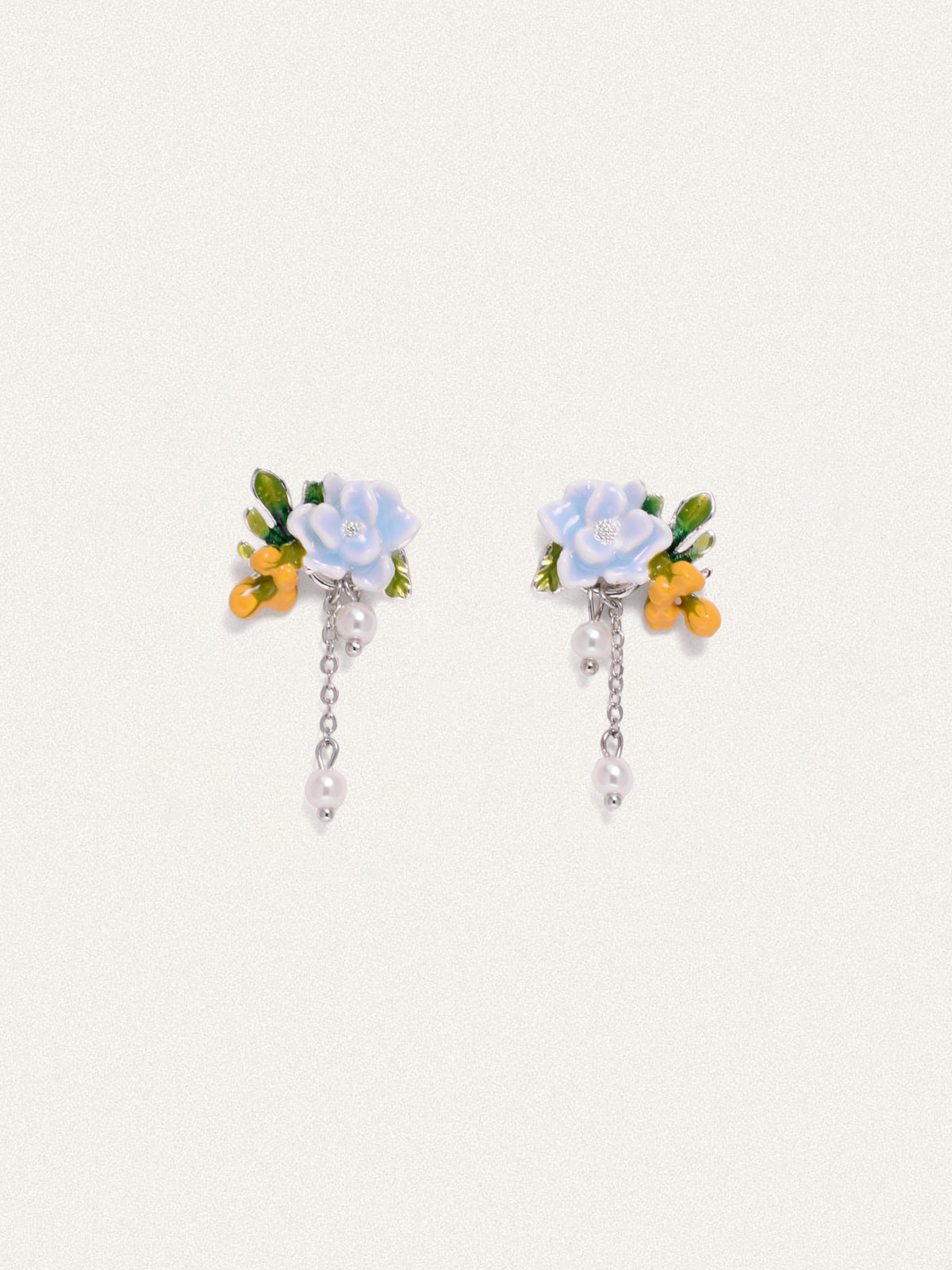 Sky-blue blossoms nestle beside sunny buds; twin pearl chains fall like morning dew. With each gentle sway, they soften the day—quiet, feminine, and full of promise.