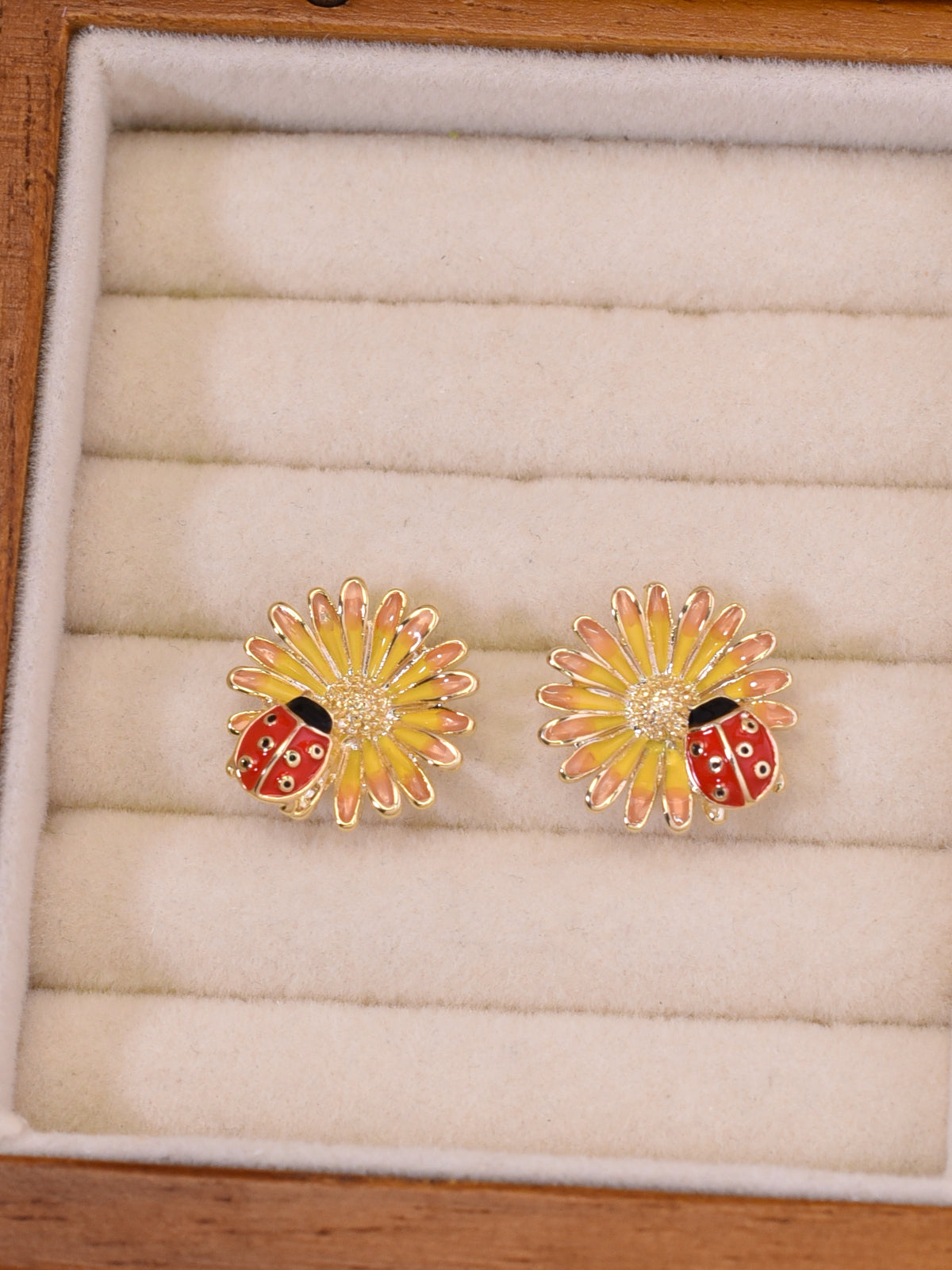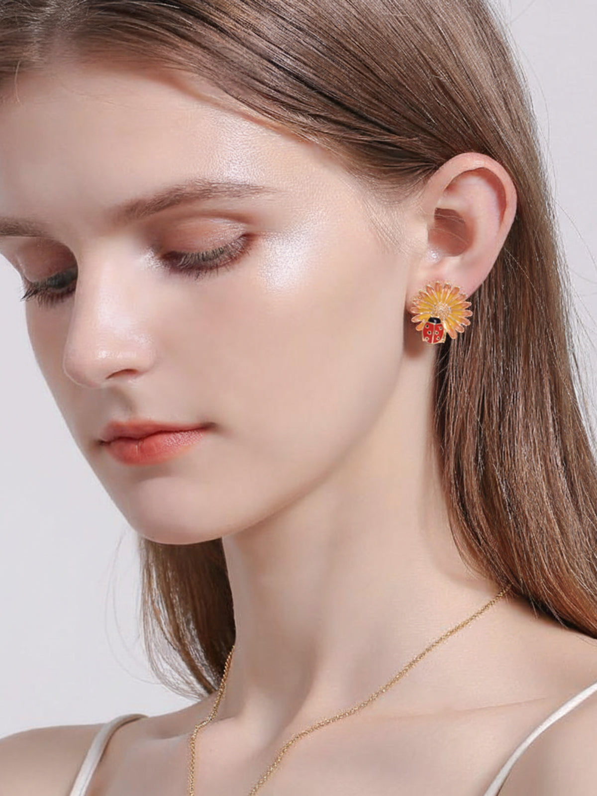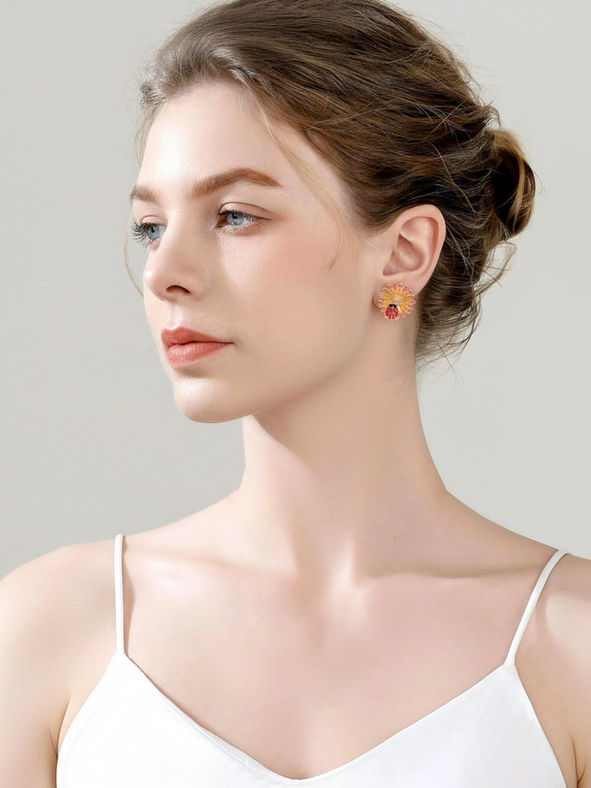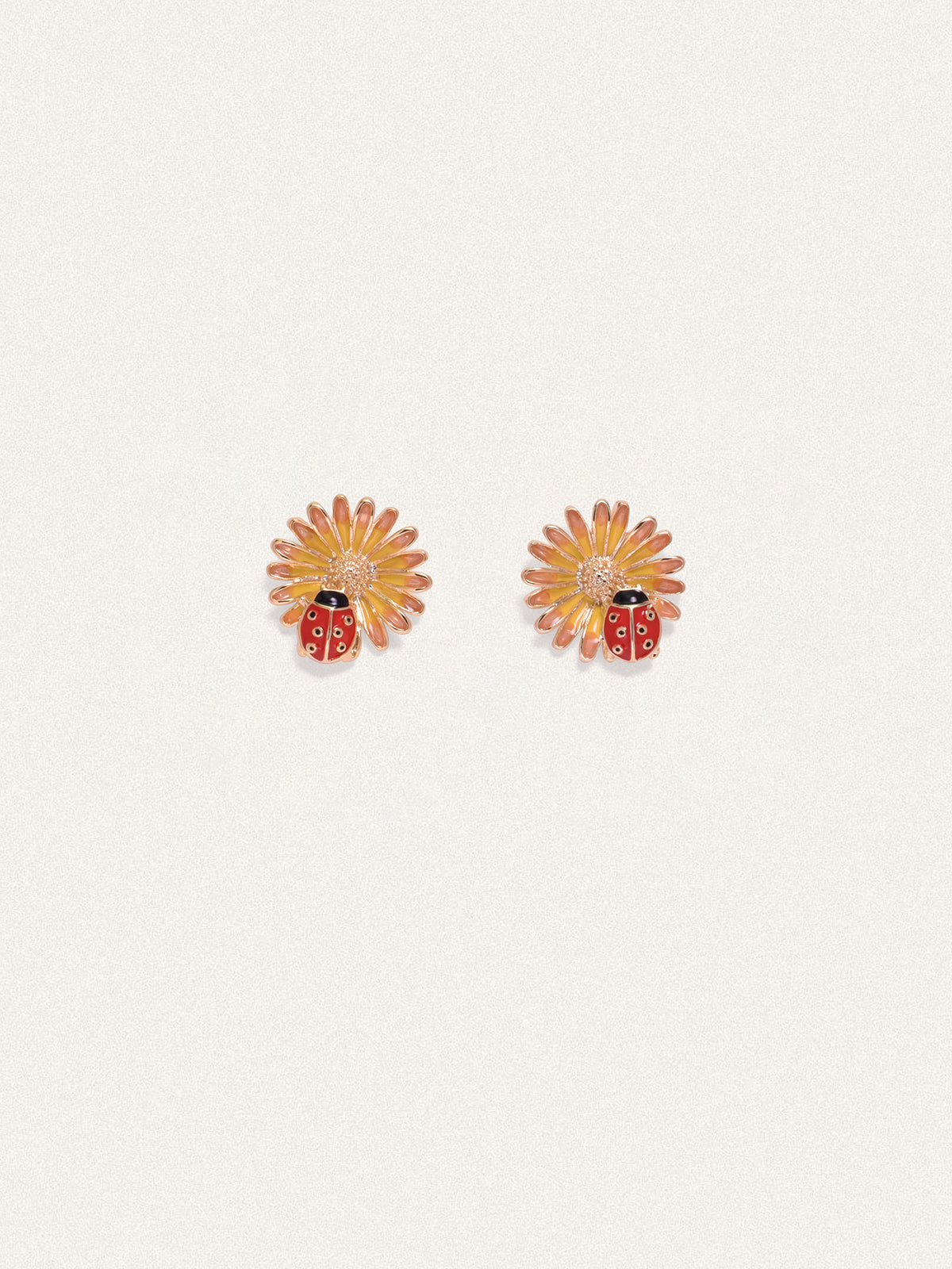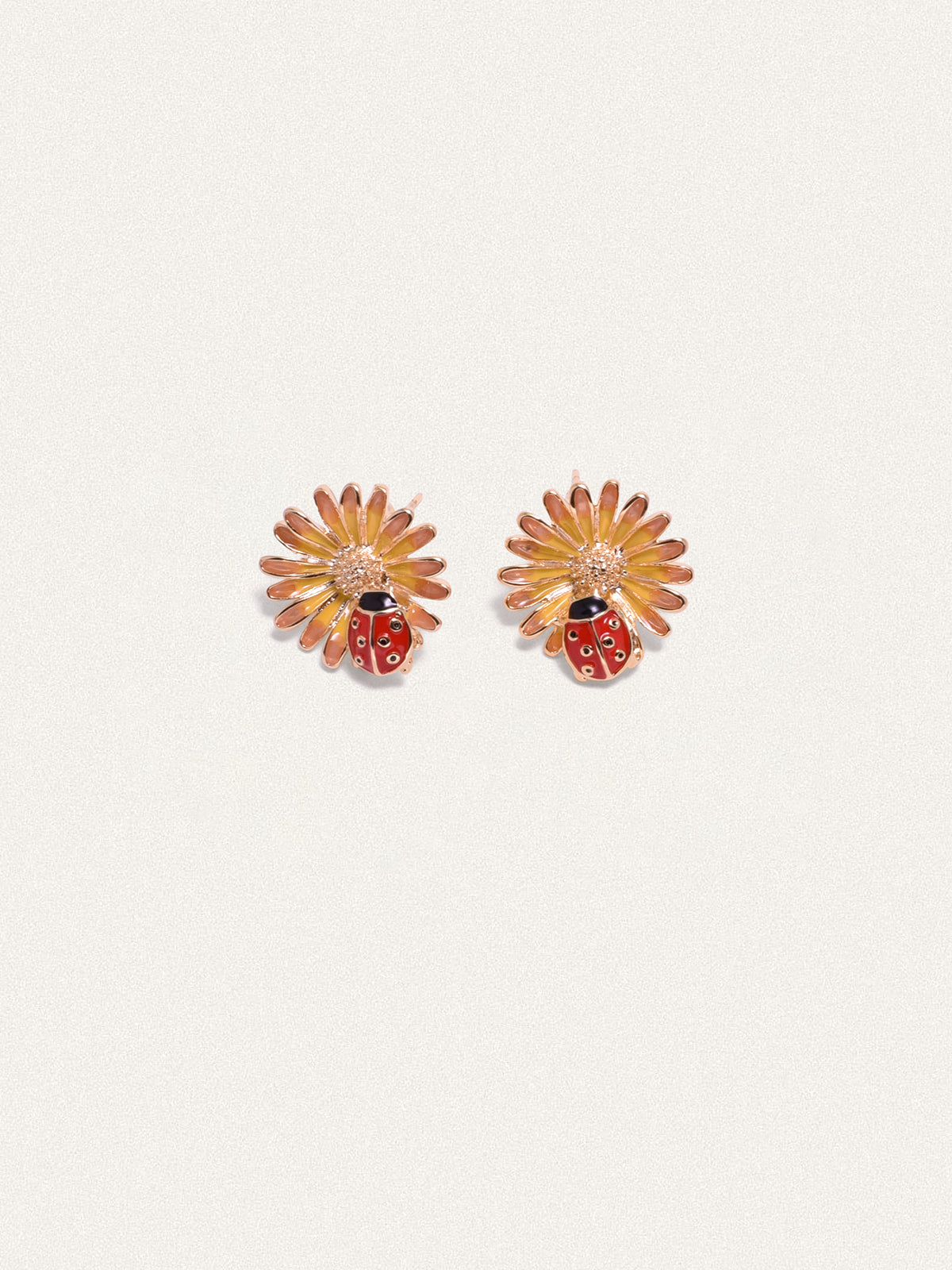 A sunny daisy shelters a tiny red ladybug—good luck landing where light lives. Petite yet radiant, these studs carry the warmth of gardens and the promise of small joys. Wear them as a pocket of cheer and quiet courage. Crafted with glossy enamel and hand-set crystals for a luminous, lasting glow.